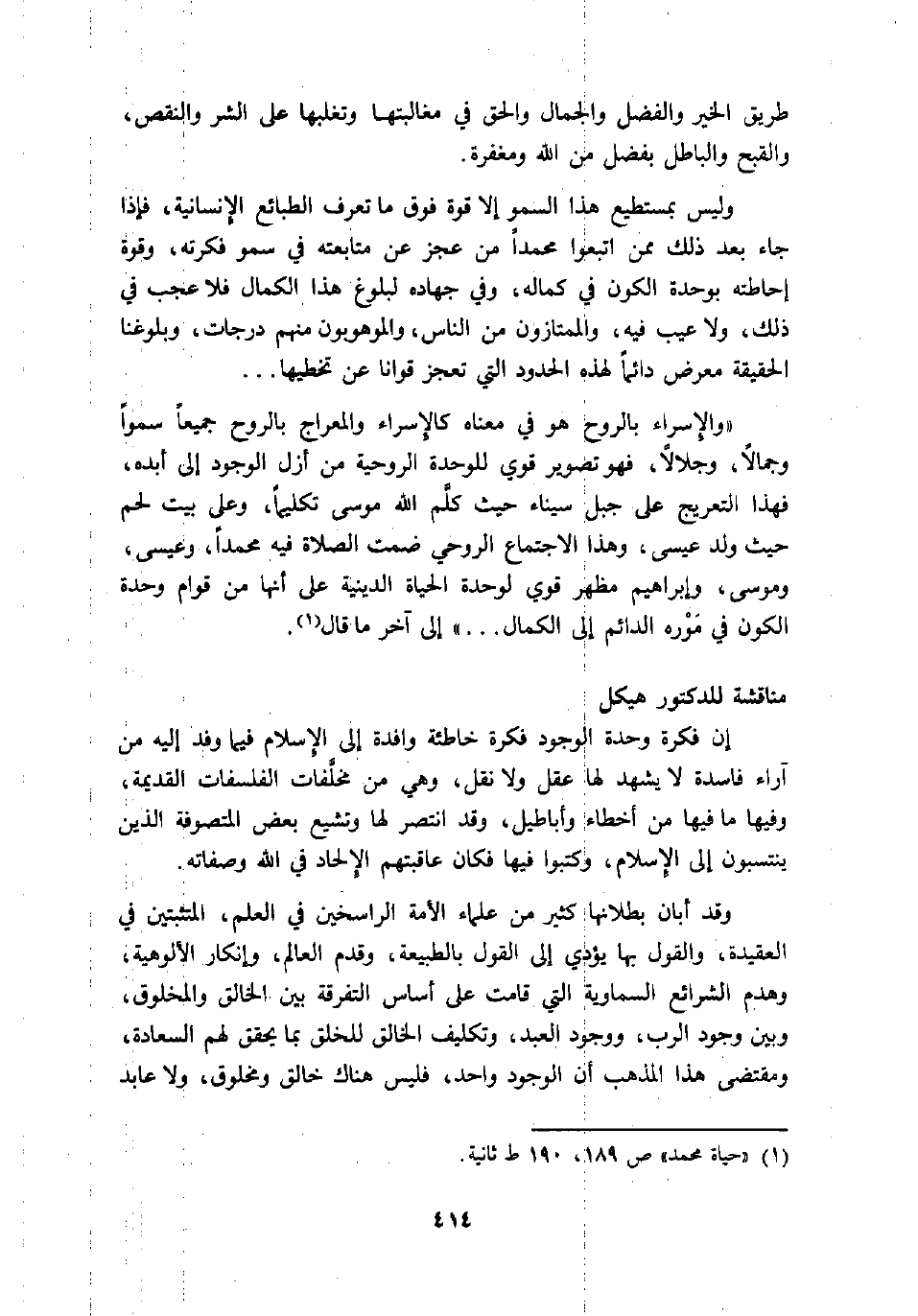«والإسراء بالروح هو في معناه كالإسراء والمعراج بالروح جميعا سموا وجمالا، وجلالا، فهو تصوير قوي للواحدة الروحية من أزل الوجود إلى أبده، فهذا التعريج على جبل سيناء حيث كلّم الله موسى تكليما، وعلى بيت لحم حيث ولد عيسى، وهذا الاجتماع الروحي ضمت الصلاة فيه محمدا، وعيسى، وموسى، وإبراهيم مظهر قوي لواحدة الحياة الدينية على أنها من قوام واحدة الكون في موره الدائم إلى الكمال ... » إلى اخر ما قال «1» .