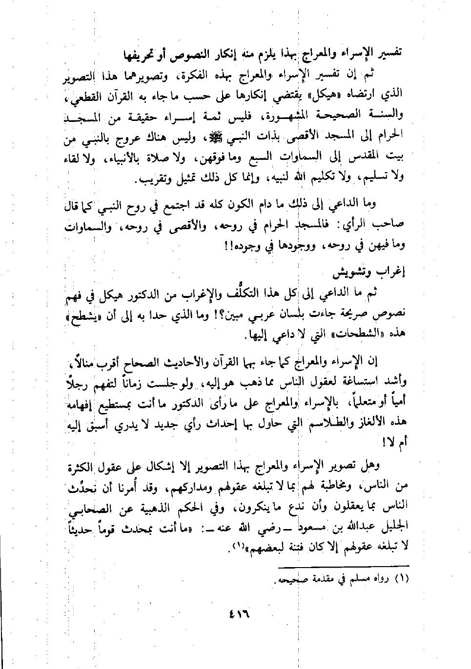 إن الإسراء والمعراج كما جاء بهما القران والأحاديث الصحاح أقرب منالا، وأشد استساغة لعقول الناس مما ذهب هو إليه، ولو جلست زمانا لتفهم رجلا أميا أو متعلما، بالإسراء والمعراج على ما رأى الدكتور ما أنت بمستطيع إفهامه هذه الألغاز والطلاسم التي حاول بها إحداث رأي جديد لا يدري أسبق إليه أم لا!
