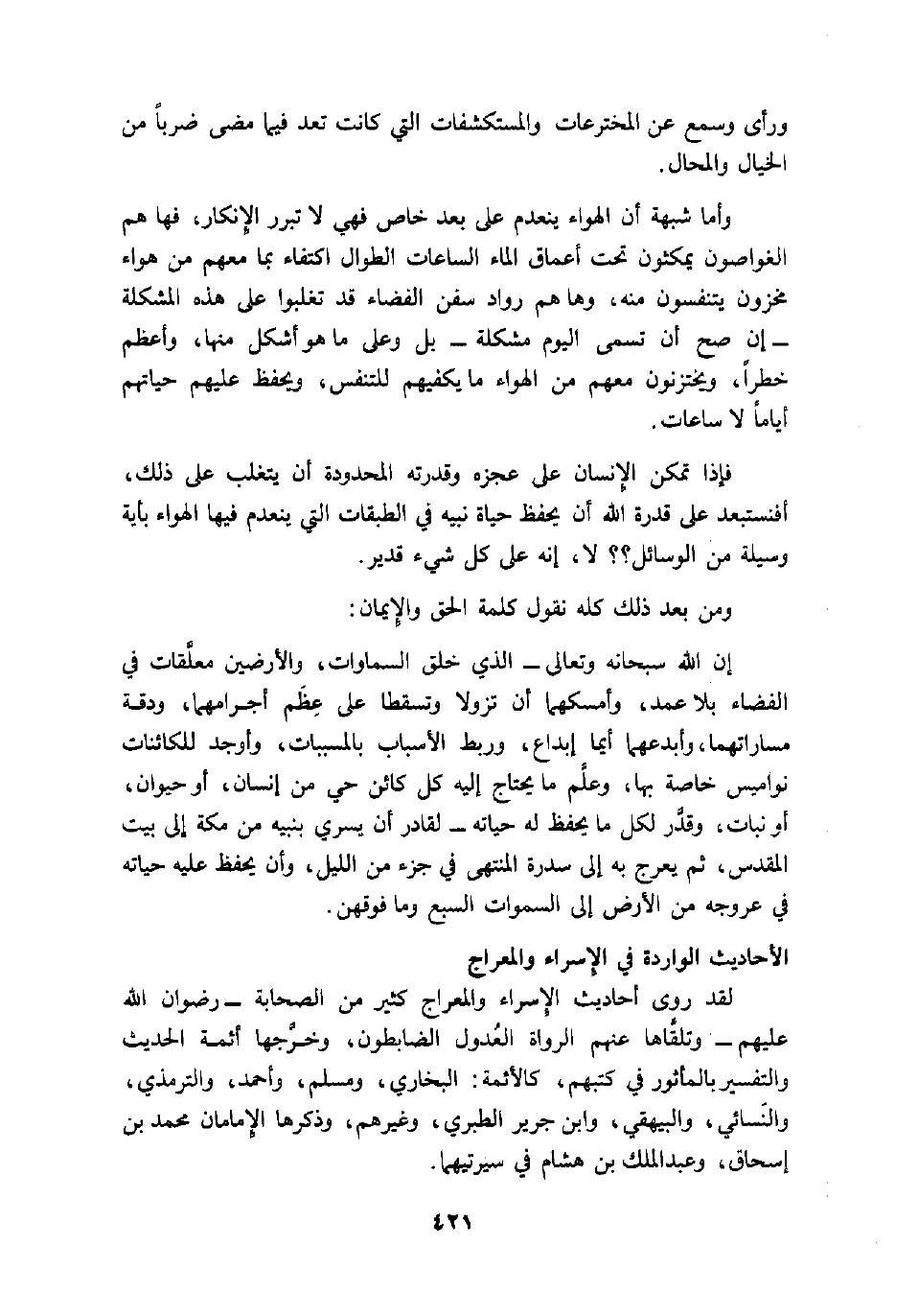 وأما شبهة أن الهواء ينعدم على بعد خاص فهي لا تبرر الإنكار، فها هم الغواصون يمكثون تحت أعماق الماء الساعات الطوال اكتفاء بما معهم من هواء مخزون يتنفسون منه، وها هم رواد سفن الفضاء قد تغلبوا على هذه المشكلة إن صح أن تسمى اليوم مشكلة- بل وعلى ما هو أشكل منها، وأعظم خطرا، ويختزنون معهم من الهواء ما يكفيهم للتنفس، ويحفظ عليهم حياتهم أياما لا ساعات.