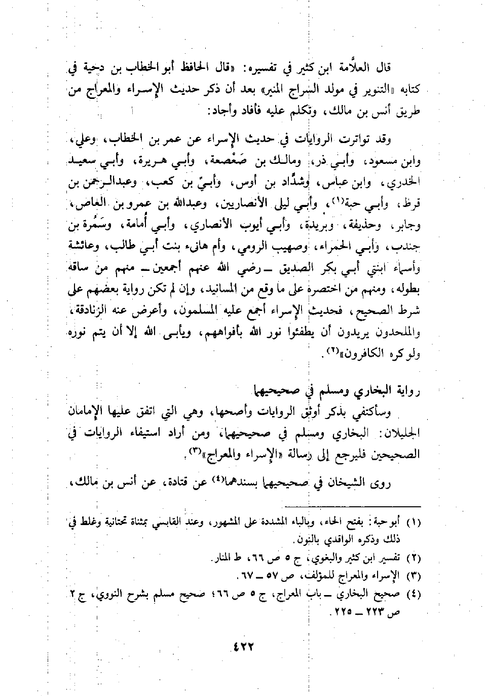 قال العلّامة ابن كثير في تفسيره: «قال الحافظ أبو الخطاب بن دحية في كتابه «التنوير في مولد السراج المنير» بعد أن ذكر حديث الإسراء والمعراج من طريق أنس بن مالك، وتكلم عليه فأفاد وأجاد: