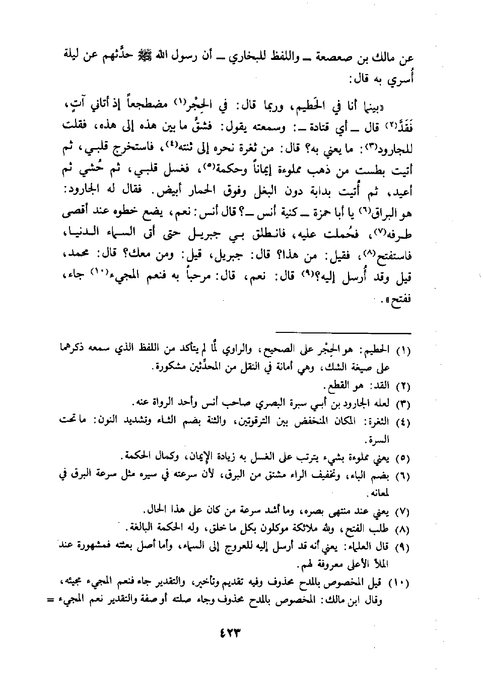 «بينما أنا في الحطيم، وربما قال: في الحجر «1» مضطجعا إذ أتاني ات، فقدّ «2» قال- أي قتادة-: وسمعته يقول: فشقّ ما بين هذه إلى هذه، فقلت للجارود «3» : ما يعني به؟ قال: من ثغرة نحره إلى ثنته «4» ، فاستخرج قلبي، ثم أتيت بطست من ذهب مملوءة إيمانا وحكمة «5» ، فغسل قلبي، ثم حشي ثم أعيد، ثم أتيت بدابة دون البغل وفوق الحمار أبيض. فقال له الجارود: