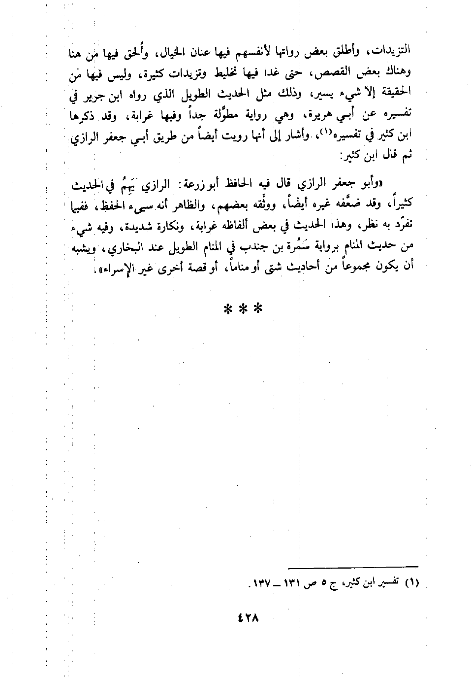 «وأبو جعفر الرازي قال فيه الحافظ أبو زرعة: الرازي يهم في الحديث كثيرا، وقد ضعّفه غيره أيضا، ووثّقه بعضهم، والظاهر أنه سيىء الحفظ، ففيما تفرّد به نظر، وهذا الحديث في بعض ألفاظه غرابة، ونكارة شديدة، وفيه شيء من حديث المنام برواية سمرة بن جندب في المنام الطويل عند البخاري، ويشبه أن يكون مجموعا من أحاديث شتى أو مناما، أو قصة أخرى غير الإسراء» .