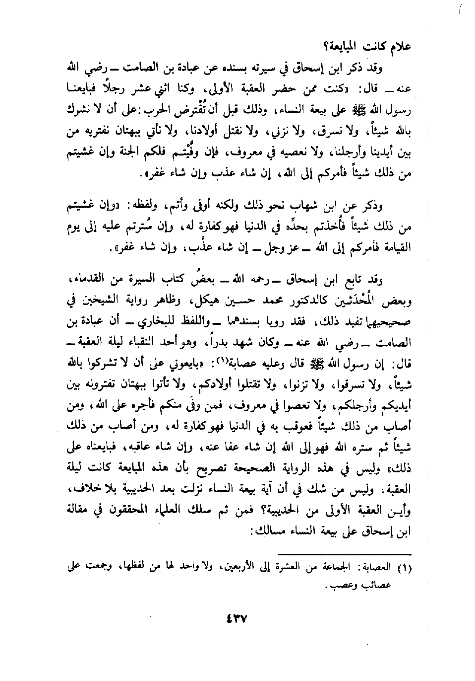 وقد تابع ابن إسحاق- رحمه الله- بعض كتاب السيرة من القدماء، وبعض المحدثين كالدكتور محمد حسين هيكل، وظاهر رواية الشيخين في صحيحيهما تفيد ذلك، فقد رويا بسندهما- واللفظ للبخاري- أن عبادة بن الصامت- رضي الله عنه- وكان شهد بدرا، وهو أحد النقباء ليلة العقبة- قال: إن رسول الله صلّى الله عليه وسلّم قال وعليه عصابة «1» : «بايعوني على ألاتشركوا بالله شيئا، ولا تسرقوا، ولا تزنوا، ولا تقتلوا أولادكم، ولا تأتوا ببهتان تفترونه بين أيديكم وأرجلكم، ولا تعصوا في معروف، فمن وفى منكم فأجره على الله، ومن أصاب من ذلك شيئا فعوقب به في الدنيا فهو كفارة له، ومن أصاب من ذلك شيئا ثم ستره الله فهو إلى الله إن شاء عفا عنه، وإن شاء عاقبه، فبايعناه على ذلك» وليس في هذه الرواية الصحيحة تصريح بأن هذه المبايعة كانت ليلة العقبة، وليس من شك في أن اية بيعة النساء نزلت بعد الحديبية بلا خلاف، وأين العقبة الأولى من الحديبية؟ فمن ثم سلك العلماء المحققون في مقالة ابن إسحاق على بيعة النساء مسالك: