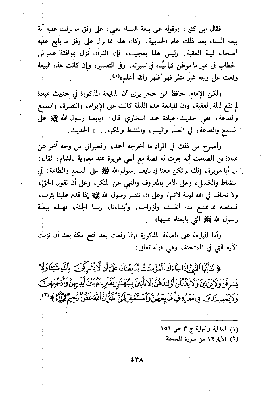 فقال ابن كثير: «وقوله على بيعة النساء يعني: على وفق ما نزلت عليه اية بيعة النساء بعد ذلك عام الحديبية، وكان هذا مما نزل على وفق ما بايع عليه أصحابه ليلة العقبة. وليس هذا بعجيب، فإن القران نزل بموافقة عمر بن الخطاب في غير ما موطن كما بيّناه في سيرته، وفي التفسير، وإن كانت هذه البيعة وقعت على وجه غير متلو فهو أظهر والله أعلم» «1» .