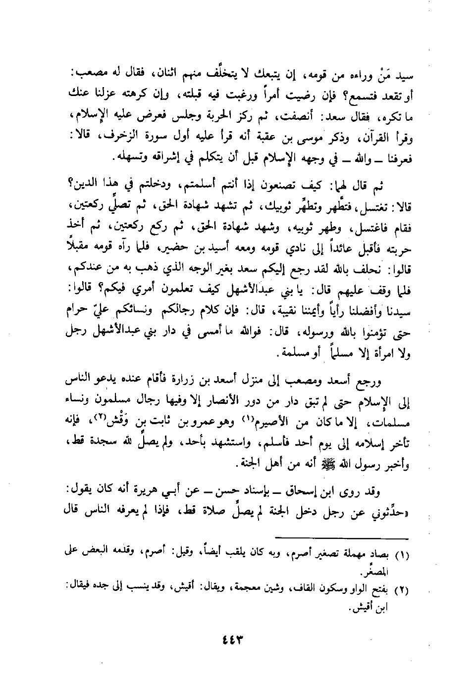 ورجع أسعد ومصعب إلى منزل أسعد بن زرارة فأقام عنده يدعو الناس إلى الإسلام حتى لم تبق دار من دور الأنصار إلا وفيها رجال مسلمون ونساء مسلمات، إلا ما كان من الأصيرم «1» وهو عمرو بن ثابت بن وقش «2» ، فإنه تأخر إسلامه إلى يوم أحد فأسلم، واستشهد بأحد، ولم يصلّ لله سجدة قط، وأخبر رسول الله صلّى الله عليه وسلّم أنه من أهل الجنة.