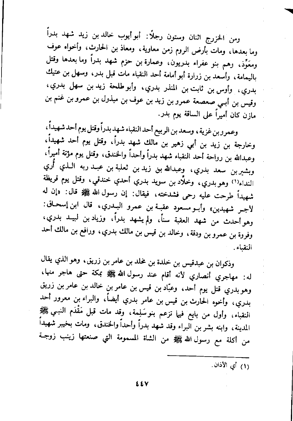 ومن الخزرج اثنان وستون رجلا: أبو أيوب خالد بن زيد شهد بدرا وما بعدها، ومات بأرض الروم زمن معاوية، ومعاذ بن الحارث، وأخواه عوف ومعوّذ، وهم بنو عفراء بدريون، وعمارة بن حزم شهد بدرا وما بعدها وقتل باليمامة، وأسعد بن زرارة أبو أمامة أحد النقباء مات قبل بدر، وسهل بن عتيك بدري، وأوس بن ثابت بن المنذر بدري، وأبو طلحة زيد بن سهل بدري، وقيس بن أبي صعصعة عمرو بن زيد بن عوف بن مبذول بن عمرو بن غنم بن مازن كان أميرا على الساقة يوم بدر.