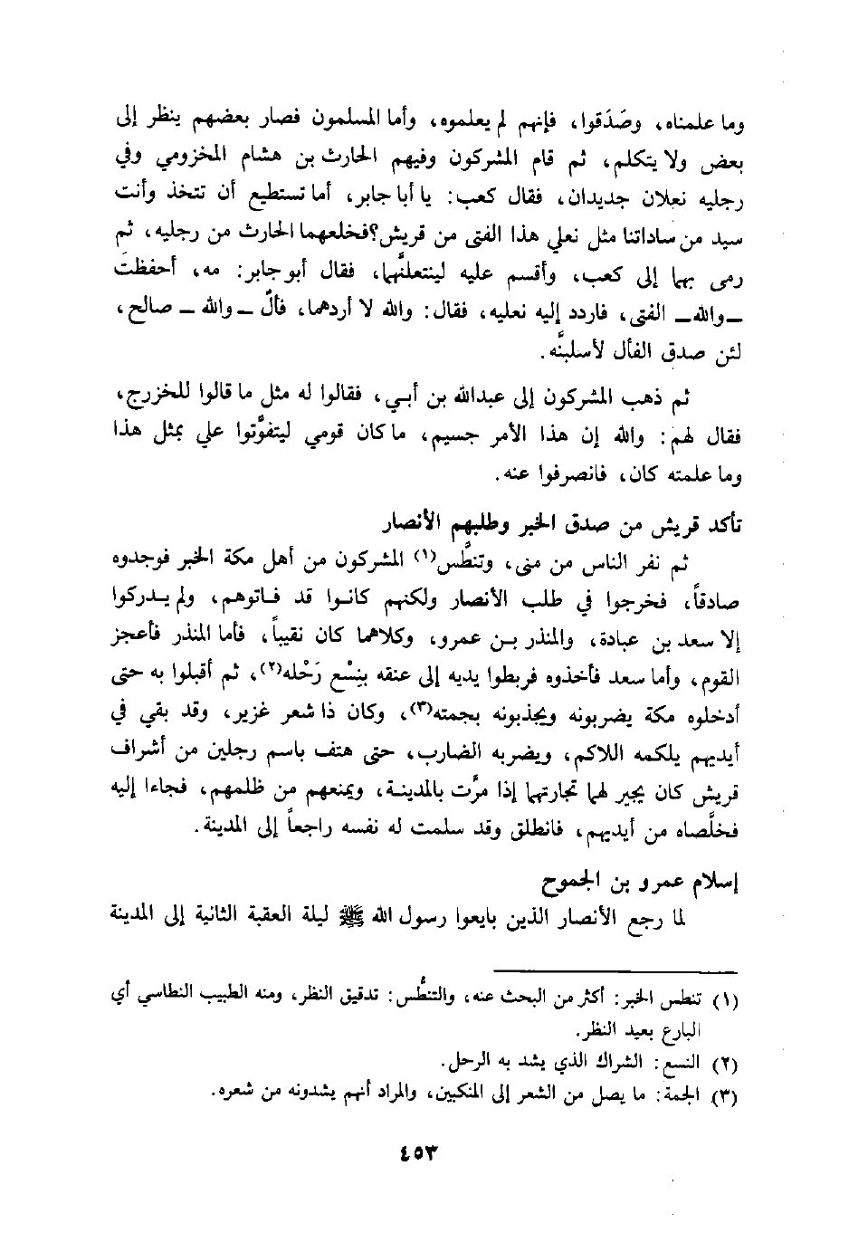 وما علمناه، وصدقوا، فإنهم لم يعلموه، وأما المسلمون فصار بعضهم ينظر إلى بعض ولا يتكلم، ثم قام المشركون وفيهم الحارث بن هشام المخزومي وفي رجليه نعلان جديدان، فقال كعب: يا أبا جابر، أما تستطيع أن تتخذ وأنت سيد من ساداتنا مثل نعلي هذا الفتى من قريش؟ فخلعهما الحارث من رجليه، ثم رمى بهما إلى كعب، وأقسم عليه لينتعلنّهما، فقال أبو جابر: مه، أحفظت والله- الفتى، فاردد إليه نعليه، فقال: والله لا أردهما، فأل- والله- صالح، لئن صدق الفأل لأسلبنّه.
