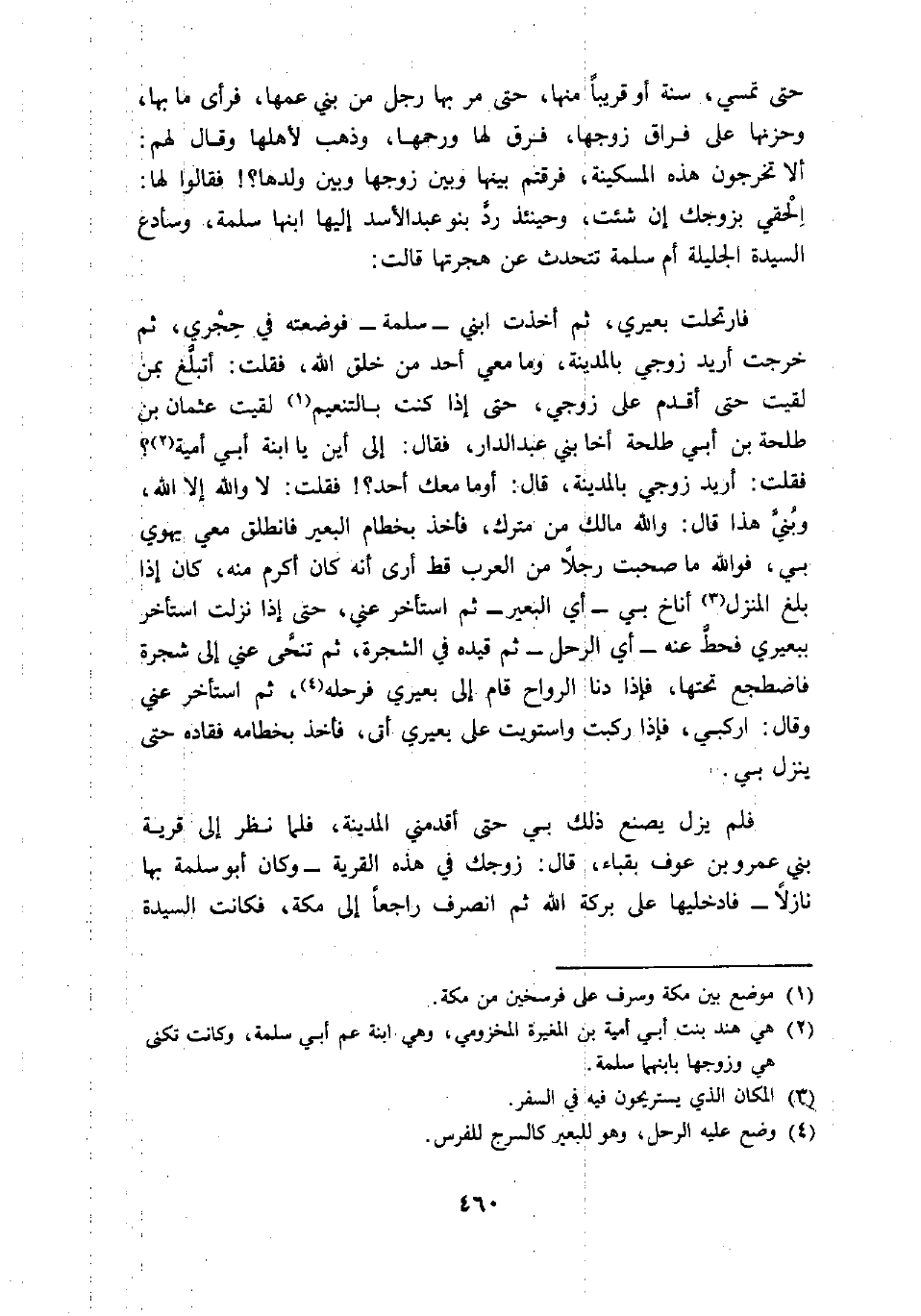 فارتحلت بعيري، ثم أخذت ابني- سلمة- فوضعته في حجري، ثم خرجت أريد زوجي بالمدينة، وما معي أحد من خلق الله، فقلت: أتبلّغ بمن لقيت حتى أقدم على زوجي، حتى إذا كنت بالتنعيم «1» لقيت عثمان بن طلحة بن أبي طلحة أخا بني عبد الدار، فقال: إلى أين يا ابنة أبي أمية «2» ؟