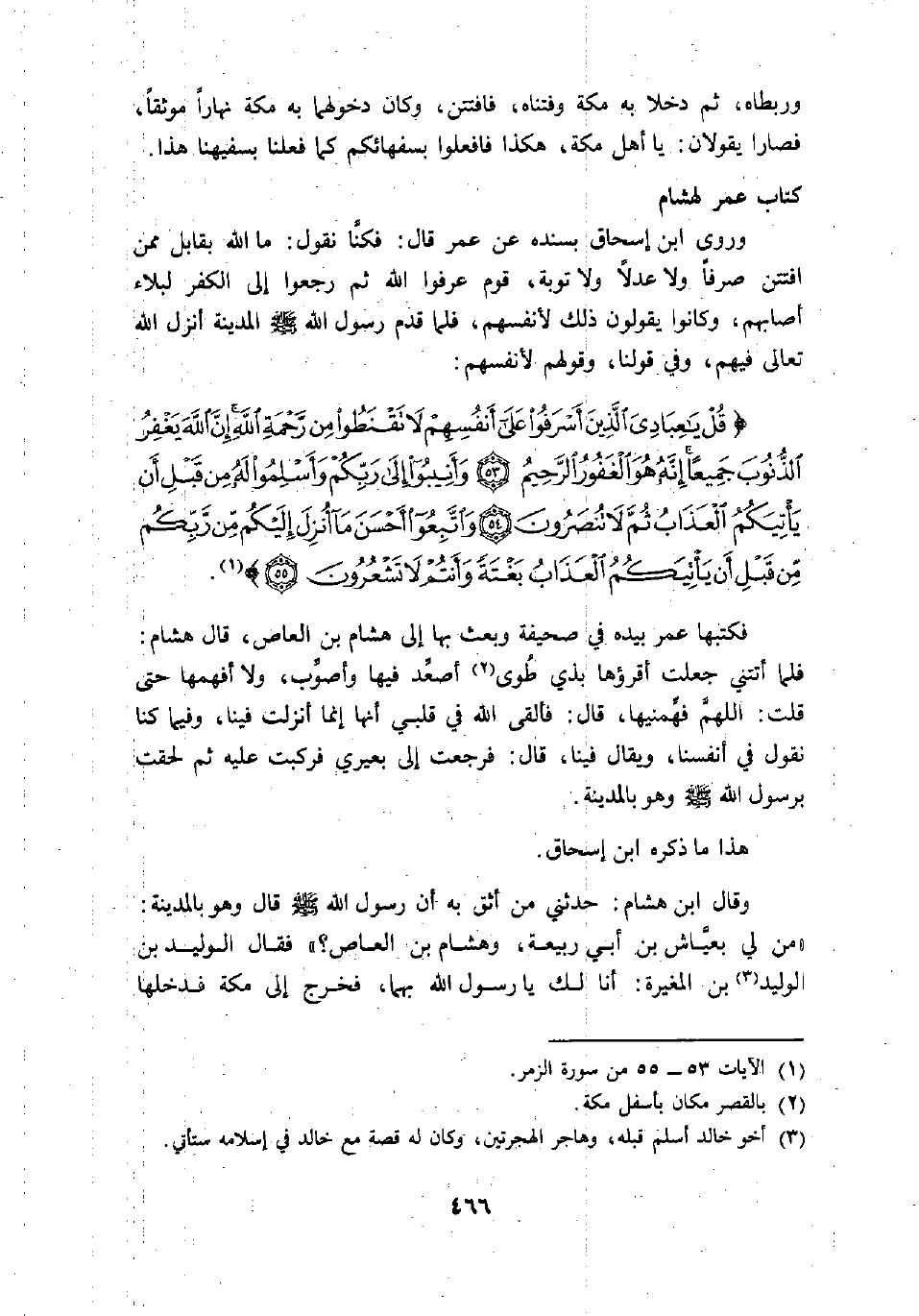 وروى ابن إسحاق بسنده عن عمر قال: فكنّا نقول: ما الله بقابل ممن افتتن صرفا ولا عدلا ولا توبة، قوم عرفوا الله ثم رجعوا إلى الكفر لبلاء أصابهم، وكانوا يقولون ذلك لأنفسهم، فلما قدم رسول الله صلّى الله عليه وسلّم المدينة أنزل الله تعالى فيهم، وفي قولنا، وقولهم لأنفسهم:
