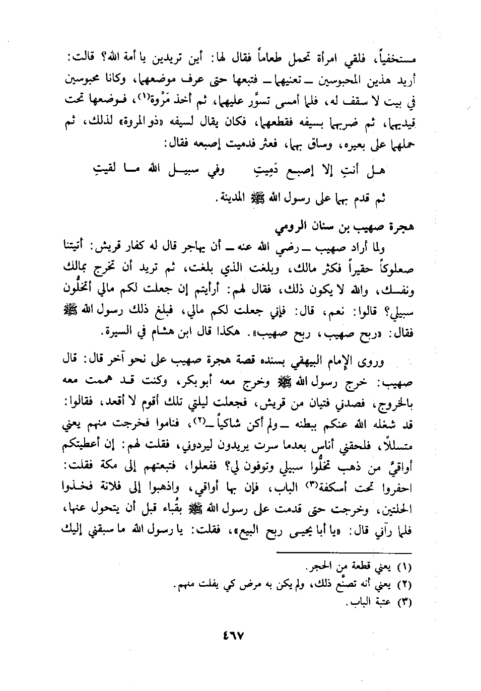 ولما أراد صهيب- رضي الله عنه- أن يهاجر قال له كفار قريش: أتيتنا صعلوكا حقيرا فكثر مالك، وبلغت الذي بلغت، ثم تريد أن تخرج بمالك ونفسك، والله لا يكون ذلك، فقال لهم: أرأيتم إن جعلت لكم مالي أتخلّون سبيلي؟ قالوا: نعم، قال: فإني جعلت لكم مالي، فبلغ ذلك رسول الله صلّى الله عليه وسلّم فقال: «ربح صهيب، ربح صهيب» . هكذا قال ابن هشام في السيرة.
