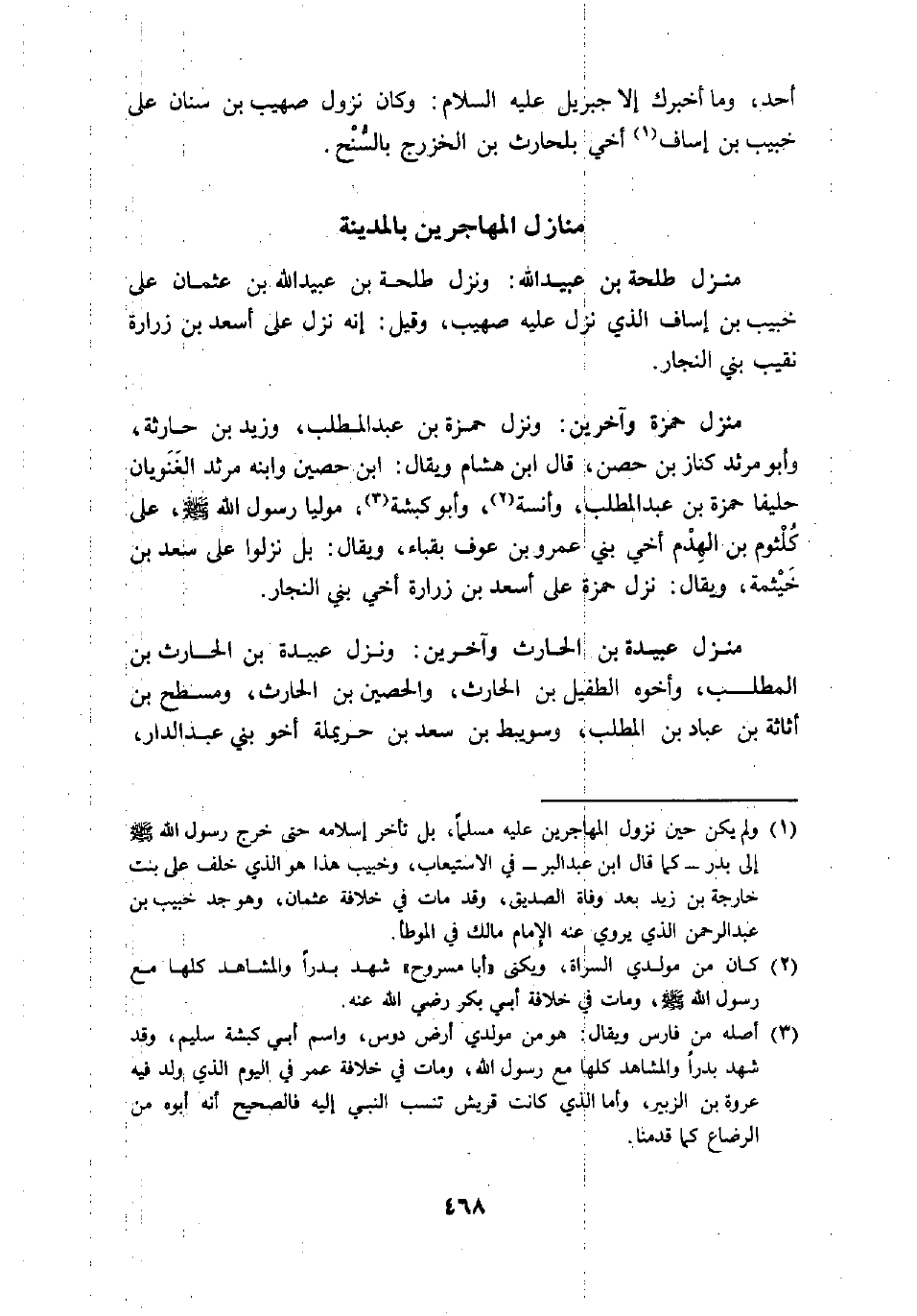منزل طلحة بن عبيد الله: ونزل طلحة بن عبيد الله بن عثمان على خبيب بن إساف الذي نزل عليه صهيب، وقيل: إنه نزل على أسعد بن زرارة نقيب بني النجار.