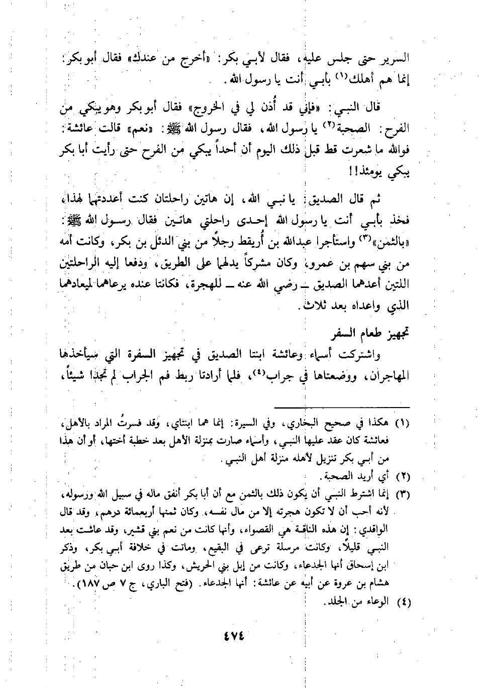 (1) هكذا في صحيح البخاري، وفي السيرة: إنما هما ابنتاي، وقد فسرت المراد بالأهل، فعائشة كان عقد عليها النبي، وأسماء صارت بمنزلة الأهل بعد خطبة أختها، أو أن هذا من أبي بكر تنزيل لأهله منزلة أهل النبي.
