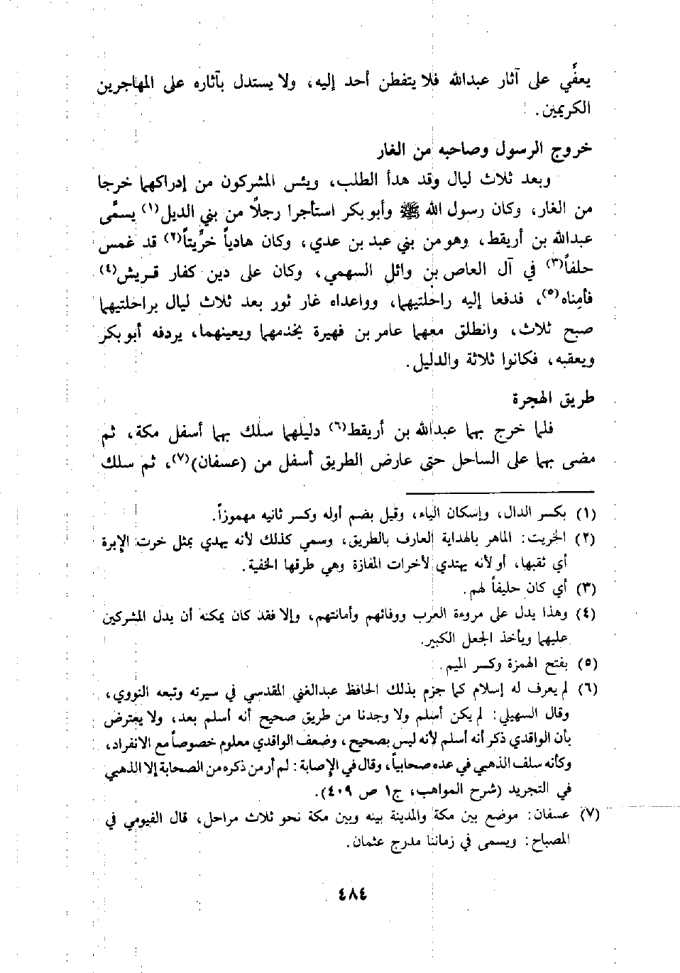 فلما خرج بهما عبد الله بن أريقط «6» دليلهما سلك بهما أسفل مكة، ثم مضى بهما على الساحل حتى عارض الطريق أسفل من (عسفان) «7» ، ثم سلك