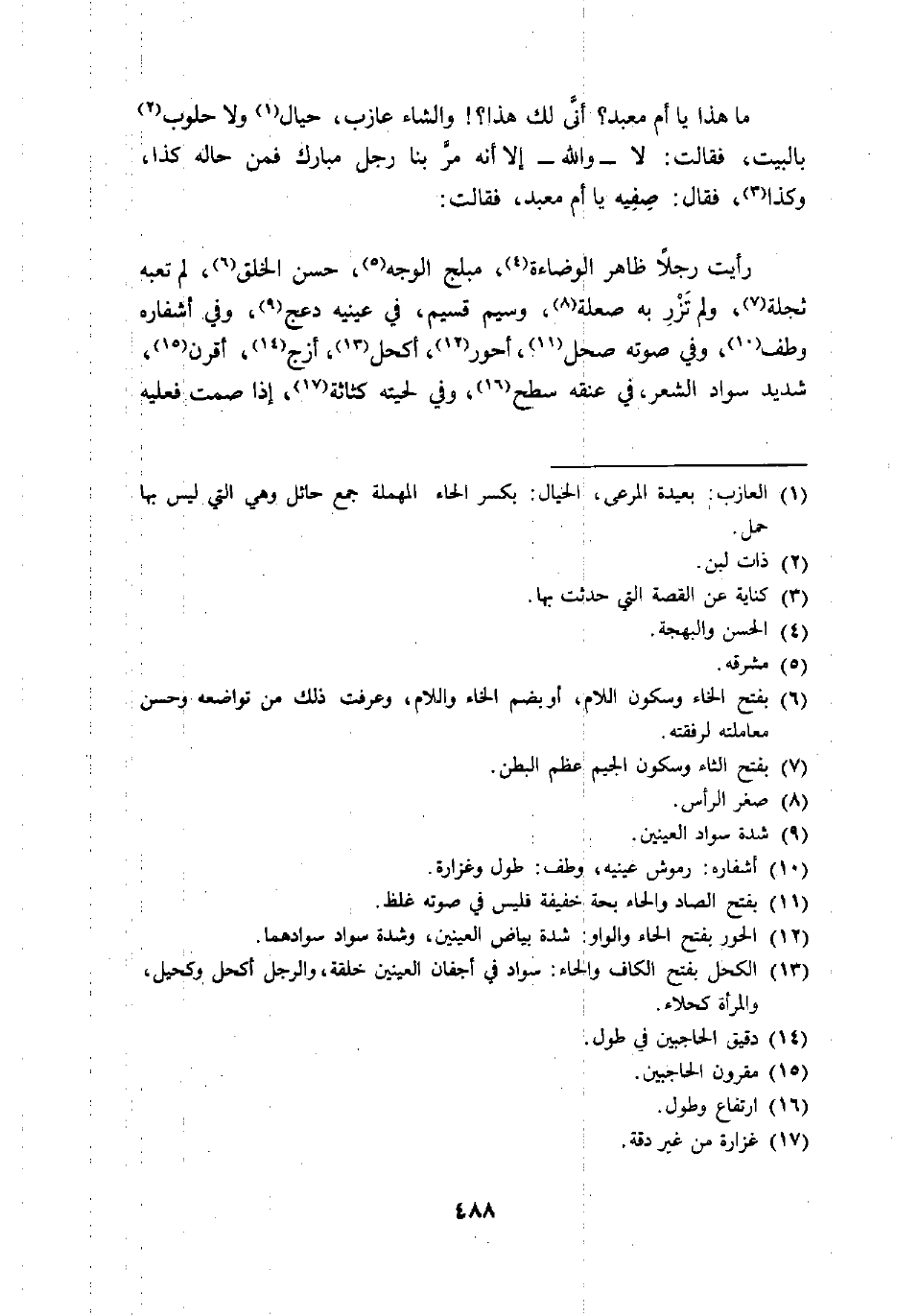 ما هذا يا أم معبد؟ أنّى لك هذا؟! والشاء عازب، حيال «1» ولا حلوب «2» بالبيت، فقالت: لا- والله- إلا أنه مرّ بنا رجل مبارك فمن حاله كذا، وكذا «3» ، فقال: صفيه يا أم معبد، فقالت: