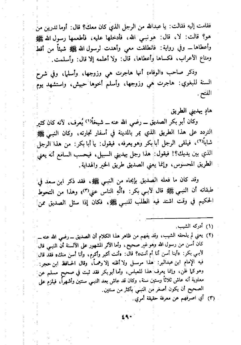 وكان أبو بكر الصديق- رضي الله عنه- شيخا «1» يعرف، لأنه كان كثير التردد على هذا الطريق الذي يمر بالمدينة في أسفار تجارته، وكان النبي صلّى الله عليه وسلّم شابا «2» ، فيلقى الرجل أبا بكر وهو يعرفه، فيقول: يا أبا بكر: من هذا الرجل الذي بين يديك؟! فيقول: هذا رجل يهديناي السبيل، فيحسب السامع أنه يعني الطريق المحسوس، وإنما يعني الصديق طريق الخير والهداية.