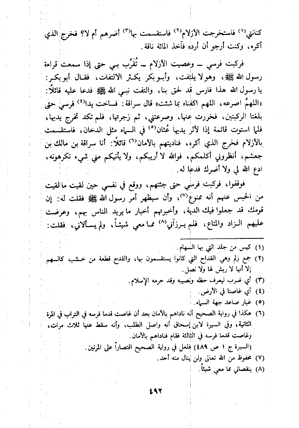 (6) هكذا في رواية الصحيح أنه ناداهم بالأمان بعد أن غاصت قدما فرسه في التراب في المرة الثانية، وفي السيرة لابن إسحاق أنه واصل الطلب، وأنه سقط عنها ثلاث مرات، وغاصت قدما فرسه في الثالثة فقام فناداهم بالأمان. (السيرة ج 1 ص 489) فلعل في رواية الصحيح اقتصارا على المرتين.
