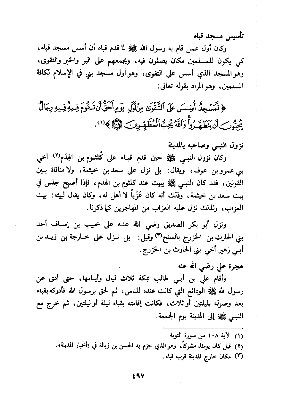 لَمَسْجِدٌ أُسِّسَ عَلَى التَّقْوى مِنْ أَوَّلِ يَوْمٍ أَحَقُّ أَنْ تَقُومَ فِيهِ فِيهِ رِجالٌ يُحِبُّونَ أَنْ يَتَطَهَّرُوا وَاللَّهُ يُحِبُّ الْمُطَّهِّرِينَ (108) «1» .