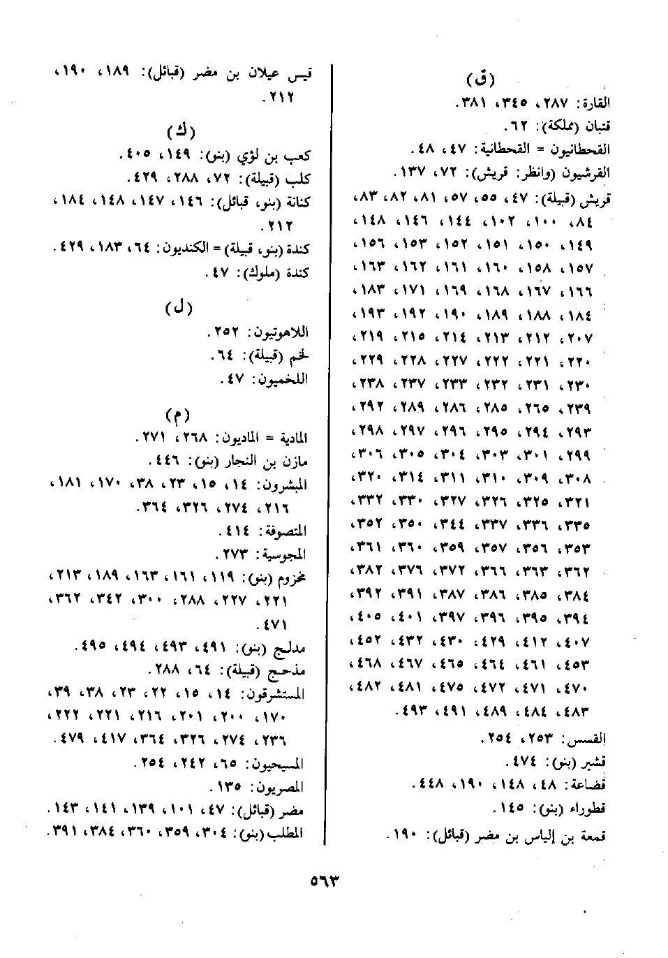 قريش (قبيلة) : 47، 55، 57، 81، 82، 83، 84، 100، 102، 144، 146، 148، 149، 150، 151، 152، 153، 156، 157، 158، 160، 161، 162، 163، 166، 167، 168، 169، 171، 183، 184، 188، 189، 190، 192، 193، 207، 212، 213، 214، 215، 219، 220، 221، 222، 227، 228، 229، 230، 231، 232، 233، 237، 238، 239، 265، 285، 286، 289، 292، 293، 294، 295، 296، 297، 298، 299، 301، 303، 304، 305، 306، 308، 309، 310، 311، 314، 320، 321، 325، 326، 327، 330، 332، 335، 336، 337، 344، 350، 352، 353، 356، 357، 359، 360، 361، 362، 363، 366، 372، 376، 382، 384، 385، 386، 387، 391، 392، 394، 395، 396، 397، 401، 405، 407، 412، 429، 430، 432، 452، 453، 461، 464، 465، 467، 468، 470، 471، 472، 475، 481، 482، 483، 484، 489، 491، 493.