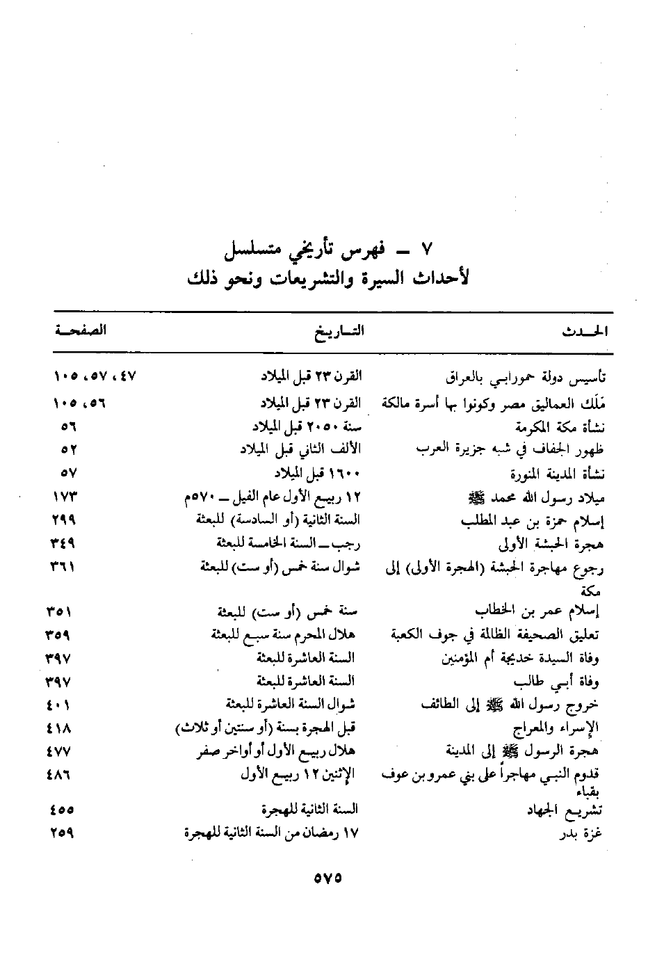 7- فهرس تأريخي متسلسل لأحداث السيرة والتشريعات ونحو ذلك