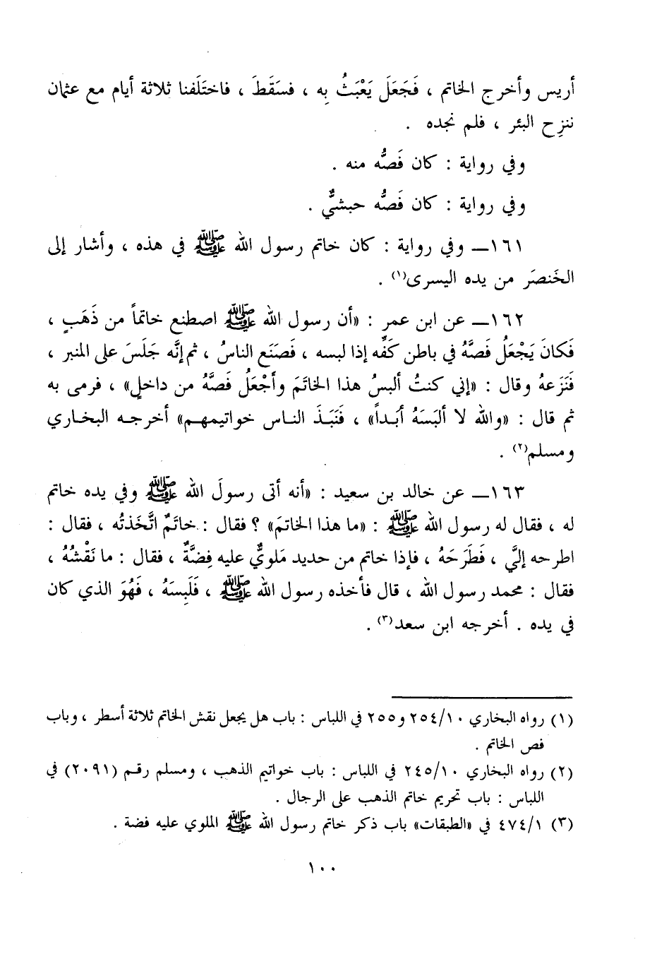 163 - عن خالد بن سعيد: "أنه أتى رسولَ الله - صلى الله عليه وسلم - وفي يده خاتم له، فقال له رسول الله - صلى الله عليه وسلم -: "ما هذا الخاتمَ"؟ فقال: خاتَمٌ اتَّخَذتُه، فقال: أطرحه إليَّ، فَطَرَحَهُ، فإذا خاتم من حديد مَلويٌّ عليه فِضَّةٌّ، فقال: ما نَقْشُهُ، فقال: محمد رسول الله، قال فأخذه رسول الله - صلى الله عليه وسلم -، فَلَبِسَهُ، فَهُوَ الذي كان في يده. أخرجه ابن سعد (¬3).