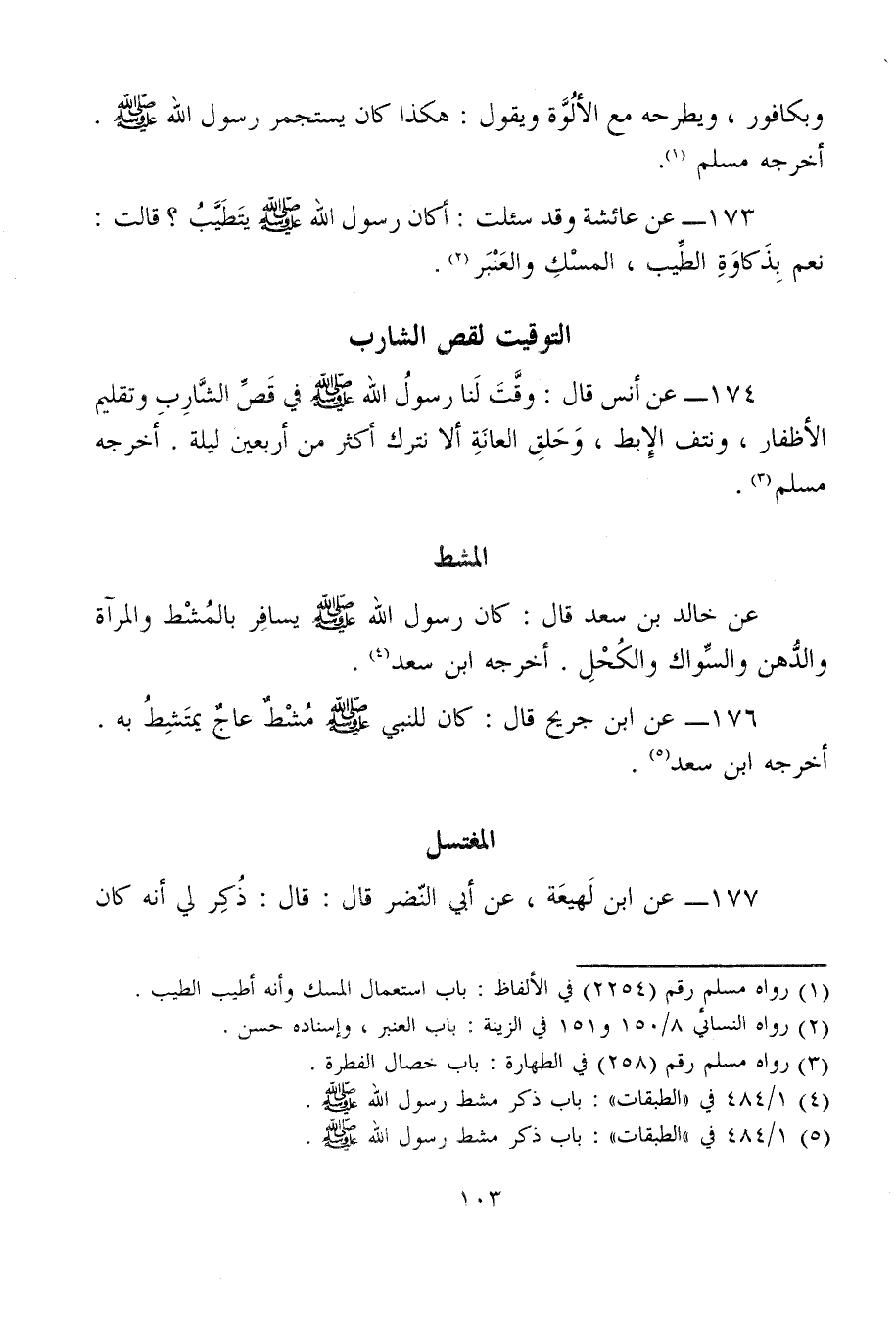 176 - عن ابن جريح قال: كان للنبي - صلى الله عليه وسلم - مُشْطٌ عَاجٌ يَمْتَشِطُ به. أخرجه ابن سعد (¬5).