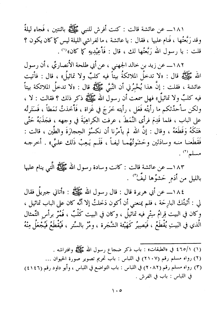 182 - عن زيد بن خالد الجهني، عن أبي طلحة الأنصاريِّ، أن رسول الله - صلى الله عليه وسلم - قال: "لا تدخلُ الملائكةُ بيتًا فيه كلبٌ ولا تماثيلُ"، قال: فأتيت عائشة، فقلت: إنَّ هذا يُخْبِرُني أن النَّبيَّ - صلى الله عليه وسلم - قال: "لا تدخلُ الملائكة بيتًا فيه كلبٌ ولا تماثيلٌ" فهل سمعت أن رسول الله - صلى الله عليه وسلم - ذكر ذلك؟ فقالت: لا، ولكن سأحدِّثكم ما رأيتُه فَعَل، رأيته خَرَجَ في غَزاة، فَأخَذتُ نَمَطًا، فَسَتَرتُه على الباب، فلما قَدِمَ فرأى النَّمَطَ، عرفت الكراهِيَةَ في وجهه، فجَذَبَه حَتَّى هَتَكَهُ وَقَطَعَهُ، وقال: إنَّ الله لم يأمرْنا أن نكسُوَ الحِجارَةَ والطِّين، قالت: فَقَطَعنا منه وسادَتَين وحَشَوتُهُما ليفًا، فَلَم يَعِبْ ذَلك عليَّ". أخرجه مسلم (¬2).