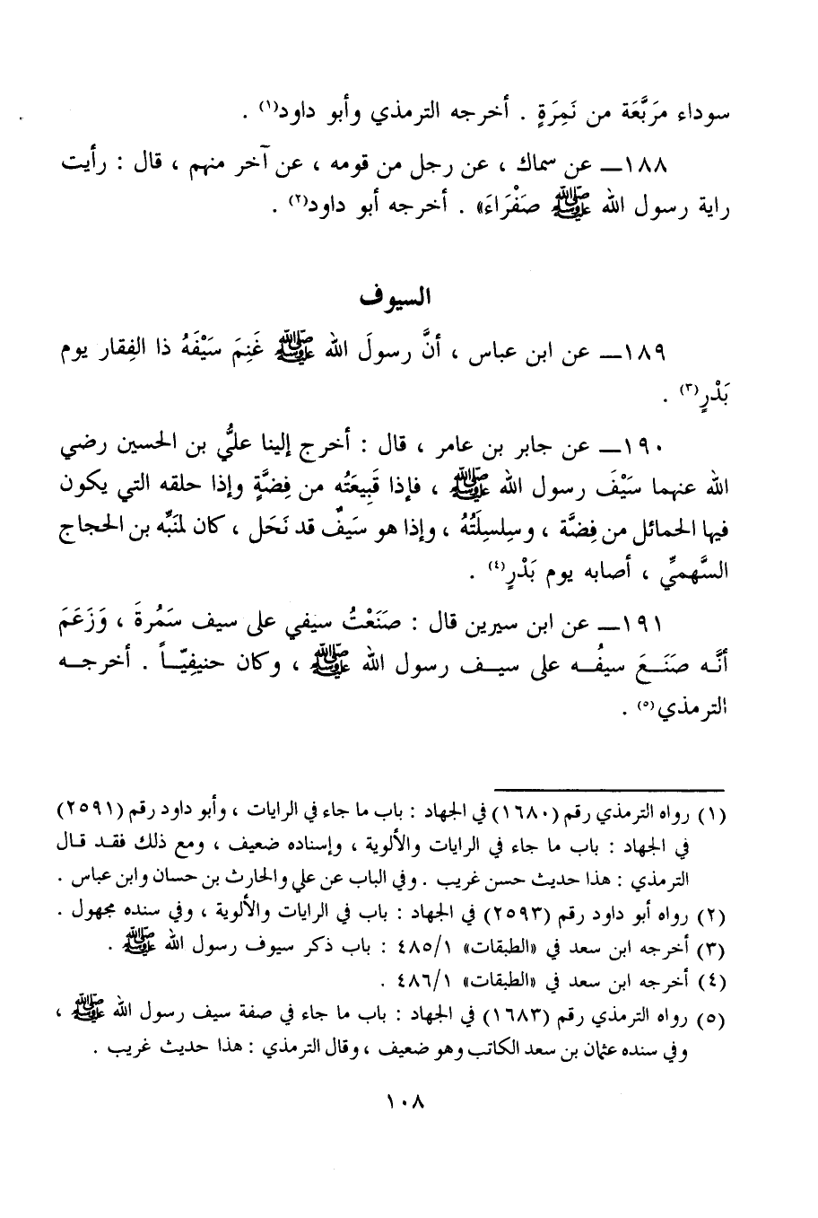 190 - عن جابر بن عامر، قال: أخرج إلينا عليُّ بن الحسين رضي الله عنهما سَيْفَ رسول الله - صلى الله عليه وسلم -، فإذا قَبِيعَتُه من فِضَّةٍ وإذا حلقه التي يكون فيها الحمائل من فِضَّة، وسِلسِلَتُهُ، وإذا هو سَيفٌ قد نَحَل، كان لمنَبِّه بن الحجاج السَّهميِّ، أصابه يوم بَدْرٍ (¬4).