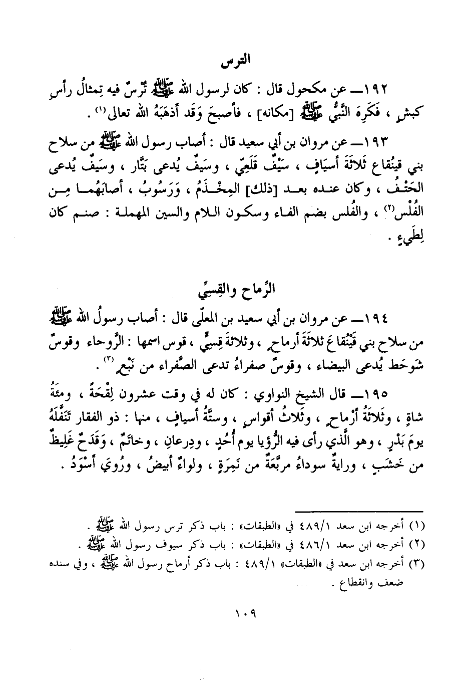 193 - عن مروان بن أبي سعيد قال: أصاب رسول الله - صلى الله عليه وسلم - من سلاح بني قينُقاع ثَلاثَةَ أسيَافٍ، سَيْفٌ قَلَعِيّ، وسَيفٌ يُدعى بَتَّار، وسَيفٌ يُدعى الحَتْفُ، وكان عنده بعد [ذلك] المِخْذَمُ، وَرَسُوبُ، أصابَهُما مِن الفُلْس (¬2)، والفُلس بضم الفاء وسكون اللام والسين المهملة: صنم كان لِطَيءٍ.