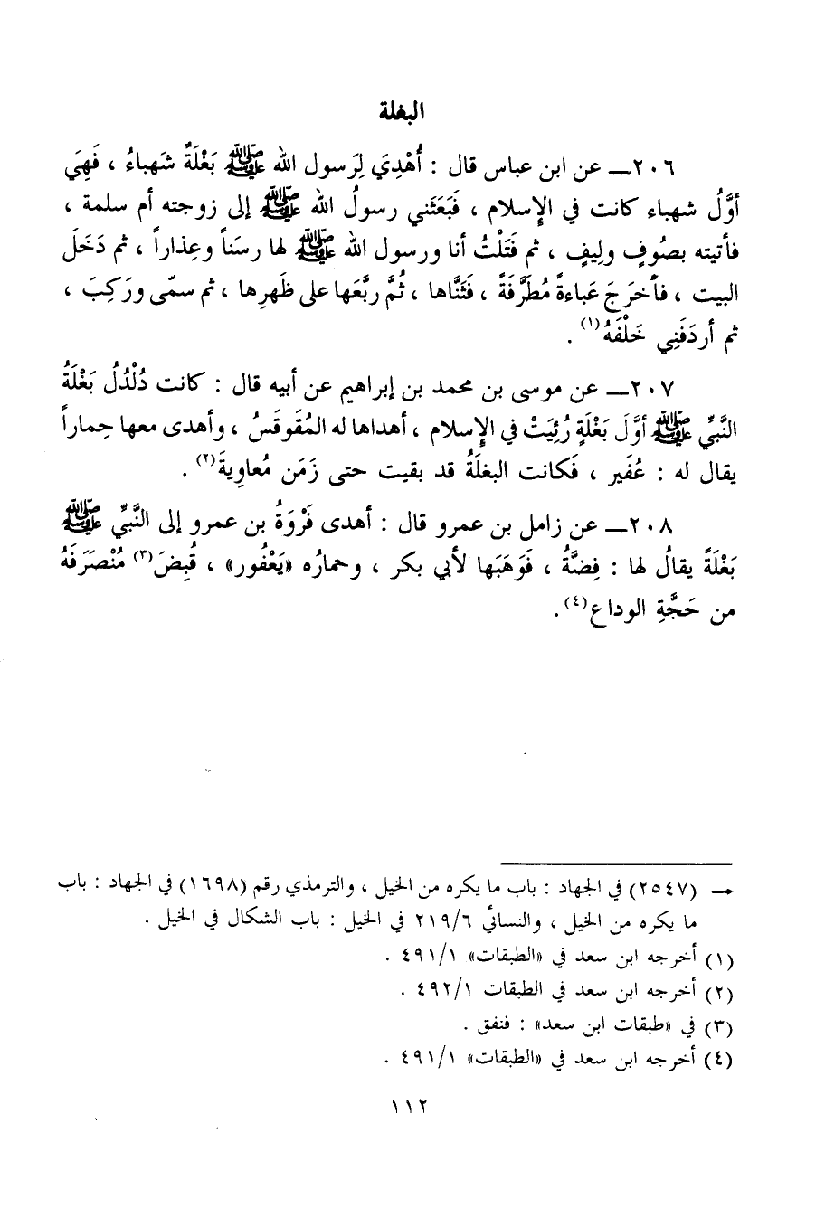 207 - عن موسى بن محمد بن إبراهيم عن أبيه قال: كانت دُلْدُلُ بَغْلَةُ النَّبيِّ - صلى الله عليه وسلم - أَوَّلِ بَغْلَةٍ رُئِيَتْ في الإسلام، أهداها له المُقَوقَسُ، وأهدى معها حِمارًا يقال له: عُفَير، فَكانت البغلَةُ قد بقيت حتى زَمَن مُعاوِيةَ (¬2).