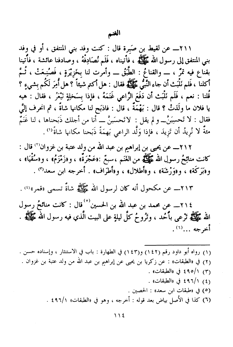 212 - عن يحيى بن إبراهيم بن عبد الله من ولد عتبة بن غزوان (¬2) قال: كانت منائِحُ رسولِ الله - صلى الله عليه وسلم - من الغَنَم، سبعٌ: "عَجْرَةٌ"، و"زَمْزَمُ"، و"سُقْيَا"، و"بَرَكَة"، و"وَرْشَة"، و"أَطلال"، و"أَطرَاف". أخرجه ابن سعد (¬3).