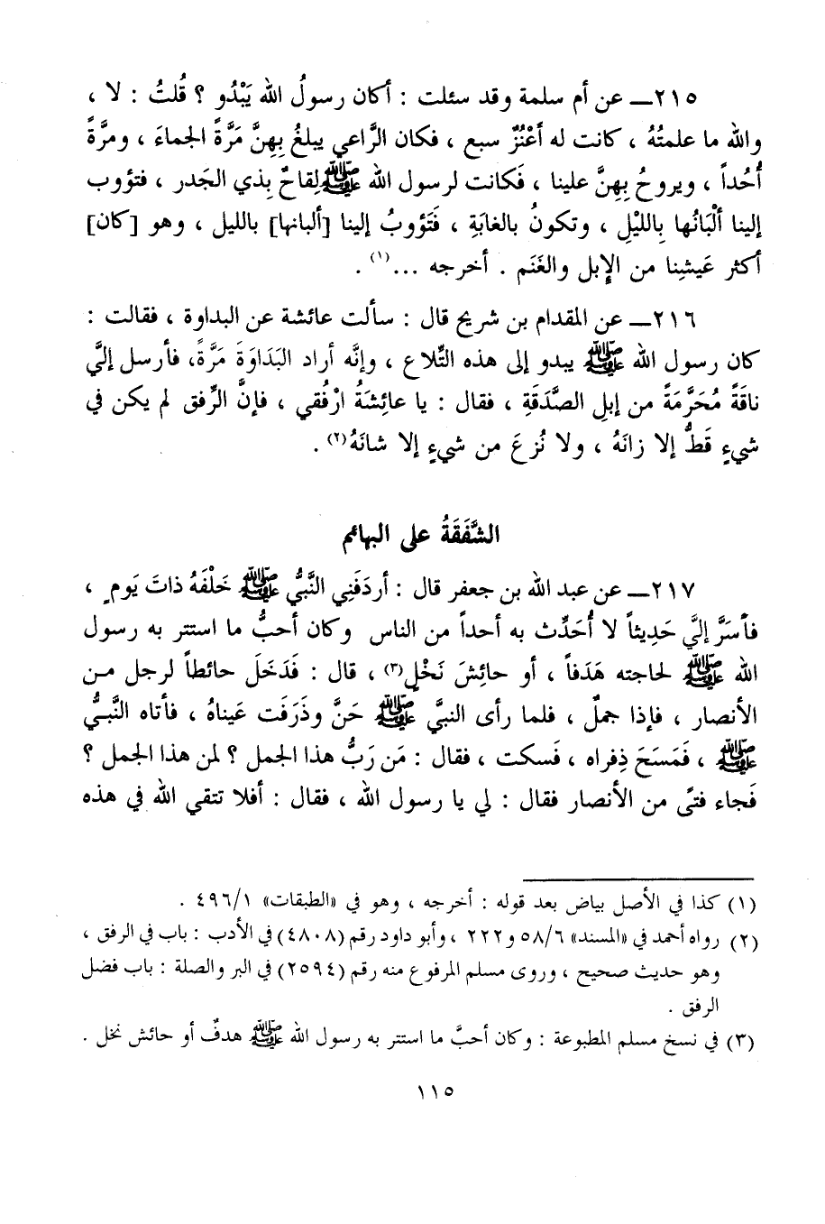 216 - عن المقدام بن شريح قال: سألت عائشة عن البداوة، فقالت: كانٍ رسول الله - صلى الله عليه وسلم - يبدو إلى هذه التِّلاع، وإنَّه أراد البَدَاوَةَ مَرةً، فأرسل إليَّ ناقَةً مُحَرَّمَةً من إبلِ الصَّدَقَةِ، فقال: يا عائِشَةُ ارْفُقي، فإنَّ الرِّفق لم يكن في شئٍ قَطُّ إلا زانَهُ، ولا تُرعَ من شيءٍ إلا شانَهُ (¬2).