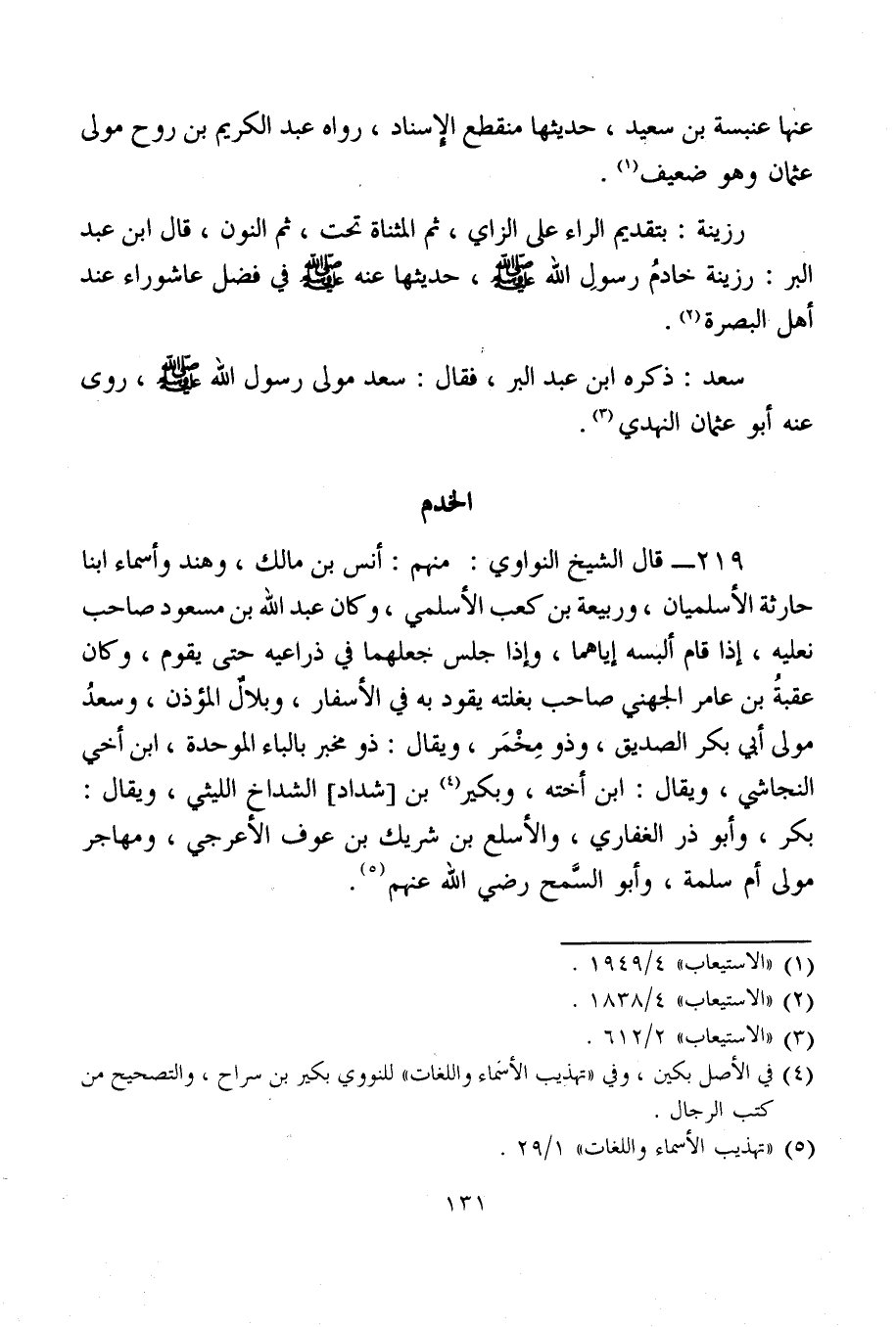 219 - قال الشيخ النواوي: منهم: أنس بن مالك، وهند وأسماء ابنا حارثة الأسلميان، وربيعة بن كعب الأسلمي، وكان عبد الله بن مسعود صاحب نعليه، إذا قام ألبسه إياهما، وإذا جلس جعلهما في ذراعيه حتى يقوم، وكان عقبةُ بن عامر الجهني صاحب بغلته يقود به في الأسفار، وبلالٌ المؤذن، وسعدُ مولى أبي بكر الصديق، وذو مِخْمَر، ويقال: ذو مخبر بالباء الموحدة، ابن أخي النجاشى، ويقال: ابن أخته، وبكير (¬4) بن [شداد] الشداخ الليثي، ويقال: بكر، وأبو ذر الغفاري، والأسلع بن شريك بن عوف الأعرجي، ومهاجر مولى أم سلمة، وأبو السَّمح رضي الله عنهم (¬5).