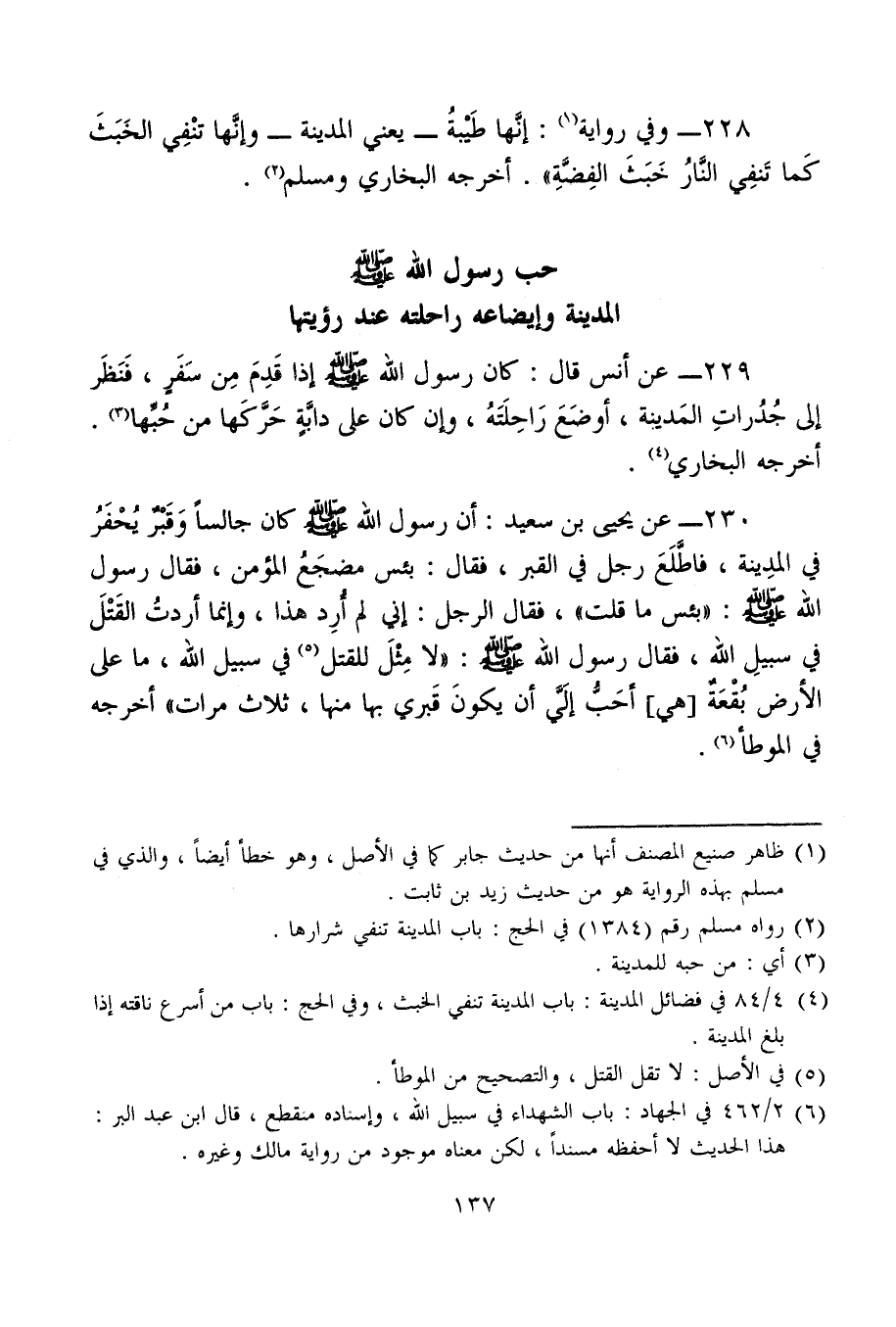 229 - عن أنس قال: كان رسول الله - صلى الله عليه وسلم - إذا قَدِمَ مِن سَفَرٍ، فَنَظَر إلى جُدُراتِ المَدينة، أوضَعَ رَاحِلَتَهُ، وإن كان على دابَّةٍ حَرَّكَها من حُبِّها (¬3). أخرجه البخاري (¬4).