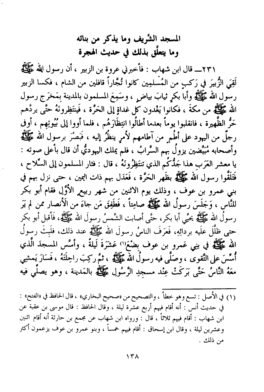 231 - قال ابن شهاب: فأخبرني عروة بن الزبير، أن رسول الله - صلى الله عليه وسلم - لَقِيَ الزُّبيرَ في رَكبٍ من المُسلمين كانوا تُجَّارًا قافلين من الشام، فكسا الزبير رسول الله - صلى الله عليه وسلم - وأبا بكر ثيابَ بياضٍ، وسَمِعَ المسلمون بالمدينة بِمَخرَج رسول الله - صلى الله عليه وسلم - من مكةَ، فكانوا يَغْدون كل غداةٍ إلى الحَرَّة، فَينتَظِرونَهُ حتَّى يردَّهم حَرُّ الظَّهيرة، فانقلبوا يومًا بعد ما أطالُوا انتِظَارَهُم، فلما أووا إلى بُيُوتِهِم، أوفى رجلٌ من اليهود على أطُمٍ من آطامهم لأمرٍ ينظُرُ إليه، فَبَصُرَ برسول الله - صلى الله عليه وسلم - وأصحابه مُبَيَّضين يزولُ بهم السَّرابُ، فلم يملك اليهوديُّ أن قال بأعلى صوته: يا معشر العَرَبِ هذا جَدُّكُم الذى تنتَظِرُونَهُ، قال: فثار المسلمون إلى السِّلاح، فَتَلَقَّوا رسول الله - صلى الله عليه وسلم - بظَهر الحَرَّة، فَعَدَل بهم ذات اليمين، حتى نزل بهم في بني عمرو بن عوف، وذلك يوم الاثنين من شهر ربيع الأوَّلِ فقام أبو بكر للنَّاس، وَجَلَسَ رسولُ الله - صلى الله عليه وسلم - صامِتًا، فَطَفِقَ مَن جاءَ من الأَنصار ممن لم يَرَ رسولُ الله - صلى الله عليه وسلم - يحيِّي أبا بكر، حتَّى أصابت الشَّمسُ رسولَ الله - صلى الله عليه وسلم -، فَأقبل أبو بكر حتى ظلَّلَ علَيه بردائِهِ، فَعرَفَ الناسُ رسولَ الله - صلى الله عليه وسلم - عند ذلك، فلَبِثَ رسولُ الله - صلى الله عليه وسلم - في بني عَمرو بن عوف بِضْعَ (¬1) عَشَرَةَ لَيلةً، وأسَّس المسجدَ الَّذي أُسِّسَ على التَّقوى، وصَلَّى فيه رسولُ الله - صلى الله عليه وسلم -، ثمَّ ركِبَ راحِلَتَهُ، فَسَارَ يَمشِي معَهُ النَّاسُ حَتَّى بَرَكَتْ عِند مسجِدِ الرَّسُولِ - صلى الله عليه وسلم - بالمَدينة، وهو يصلِّي فيه