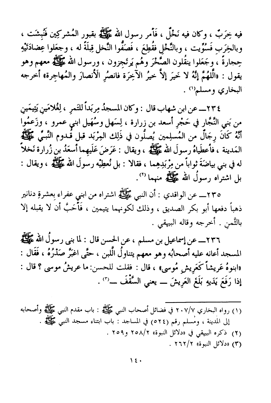 234 - عن ابن شهاب قال: وكان المسجدُ مِربَدًا للتَمرِ، لِغُلامَينِ يَتيمَينِ من بَنيِ النَّجَّار في حَجْرِ أسعد بن زرارة، لِسَهل وسُهَيل ابني عمرو، وزَعمُوا أَنَّهُ كَان رِجَالٌ من المُسلِمين يُصلُّون في ذَلِك المِرْبَد قبل قدوم النَّبيِّ - صلى الله عليه وسلم - المَدينة، فأعطَياهُ رسولَ الله - صلى الله عليه وسلم -، ويقال: عَرَضَ عَلَيهِما أسعَدُ بن زُرارة نَخلًا له في بني بياضَةَ ثوابًا من مِرْبَدِهِما، فقالا: بل نُعطِيْه رسولَ الله - صلى الله عليه وسلم -، ويقال: بل اشتراه رسولُ الله - صلى الله عليه وسلم - منهما (¬2).