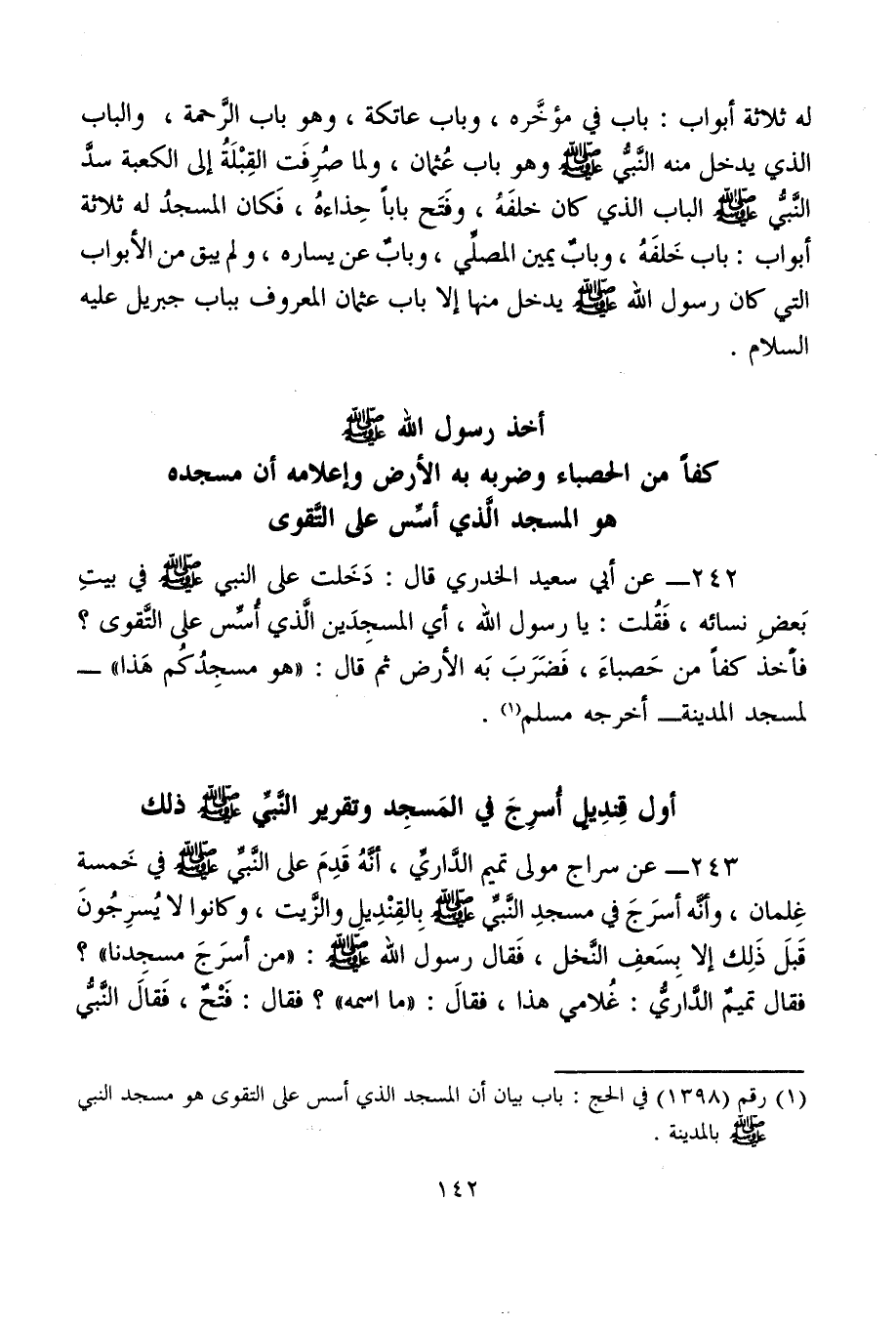 242 - عن أبي سعيد الخدري قال: دَخَلت على النبي - صلى الله عليه وسلم - في بيتِ بَعضِ نسائه، فَقُلت: يا رسول الله، أي المسجِدَين الَّذي أُسِّس على التَّقوى؟ فأخذ كفًا من حَصباءَ، فَضَرَبَ بِه الأرض ثم قال: "هو مسجِدُكُم هَذا" - لمسجد المدينة - أخرجه مسلم (¬1).
