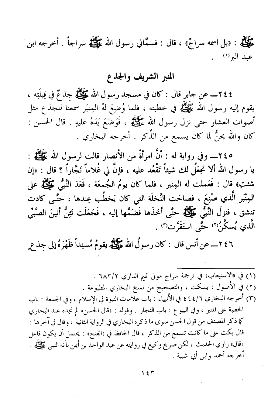 244 - عن جابر قال: كان في مسجد رسول الله - صلى الله عليه وسلم - جِذعٌ في قِبلَتِه, يقوم إليه رسول الله - صلى الله عليه وسلم - في خطبته، فلما وُضِعَ لهُ المِنبَر سمعنا للجذع مثل أصوات العشار حتى نزل رسول الله - صلى الله عليه وسلم -، فَوَضَعَ يَدَهُ عَليهِ. قال الحسن: كان والله يحنُّ لما كان يسمع من الذِّكر. أخرجه البخاري.
