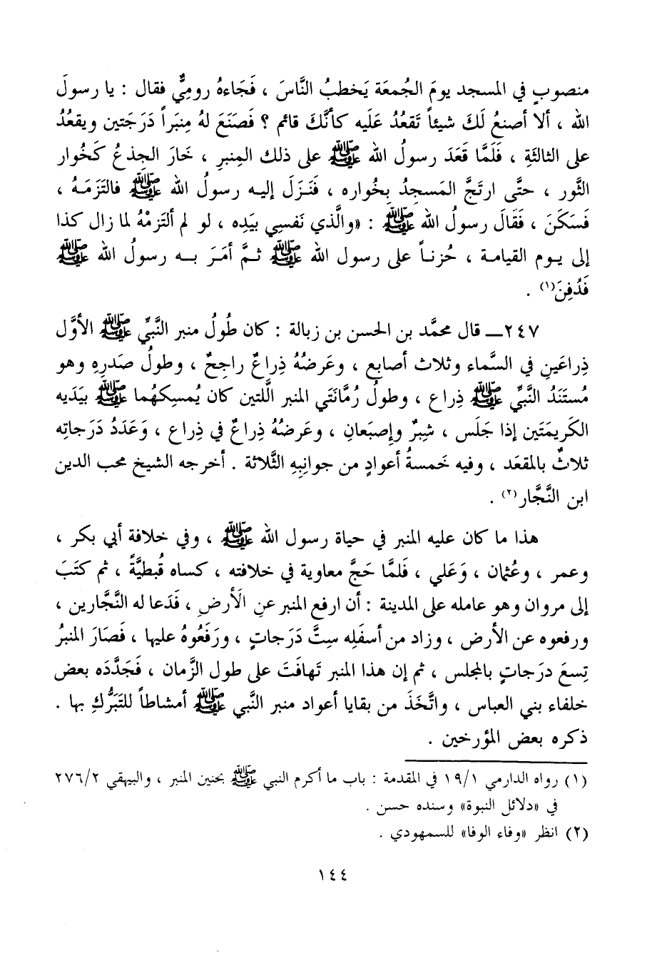 247 - قال محمَّد بن الحسن بن زبالة: كان طُولُ منبر النَّبيِّ - صلى الله عليه وسلم - الأوَّل ذِراعَينِ في السَّماء وثلاث أصابع، وعَرضُهُ ذِراعٌ راجِحٌ، وطولُ صَدرهِ وهو مُستَنَدُ النَّبيِّ - صلى الله عليه وسلم - ذِراع، وطولُ رُمَّانَتَي المنبر الَّلتين كان يُمسِكهُما - صلى الله عليه وسلم - بيَدَيه الكَريمَتَين إذا جَلَس، شِبرٌ وإِصبَعانِ، وعَرضُهُ ذِراعٌ في ذِراع، وَعَدَدُ دَرَجاتِه ثلاثٌ بالمقعَد، وفيه خَمسةُ أعوادٍ من جوانِبِهِ الثَّلاثة. أخرجه الشيخ محب الدين بن النَّجَّار (¬2).