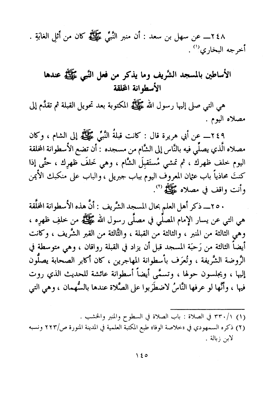 249 - عن أبي هريرة قال: كانت قبلةُ النَّبيِّ - صلى الله عليه وسلم - إلى الشام، وكان مصلاه الَّذي يصلِّي فيه بالنَّاس إلى الشَّام من مسجده: أن تضع الأسطوانة المخلقة اليوم خلف ظهرك، ثم تمشي مُستَقبِلَ الشَّام، وهي خَلفَ ظهرِك، حتَّى إذا كنتَ محاذيًا باب عثمان المعروف اليوم بباب جبريل، والباب على منكبك الأيمن وأنت واقف في مصلاه - صلى الله عليه وسلم - (¬2).