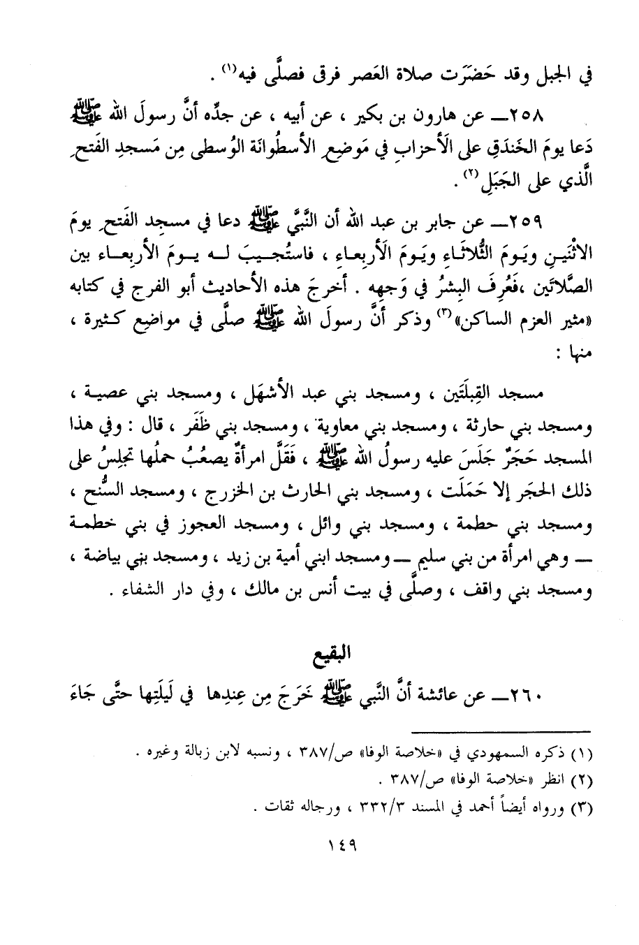 259 - عن جابر بن عبد الله أن النَّبيَّ - صلى الله عليه وسلم - دعا في مسجِد الفَتحِ يومَ الاثْنَينِ ويَومَ الثُّلاثَاءِ ويَومَ الأربِعاءِ، فاستُجيبَ له يومَ الأربِعاء بين الصَّلاتَين، فَعُرِفَ البِشرُ في وَجهِه. أخرجَ هذه الأحاديث أبو الفرج في كتابه "مثير العزم الساكن" (¬3) وذكر أنَّ رسولَ الله - صلى الله عليه وسلم - صلَّى في مواضِع كثيرة، منها:
