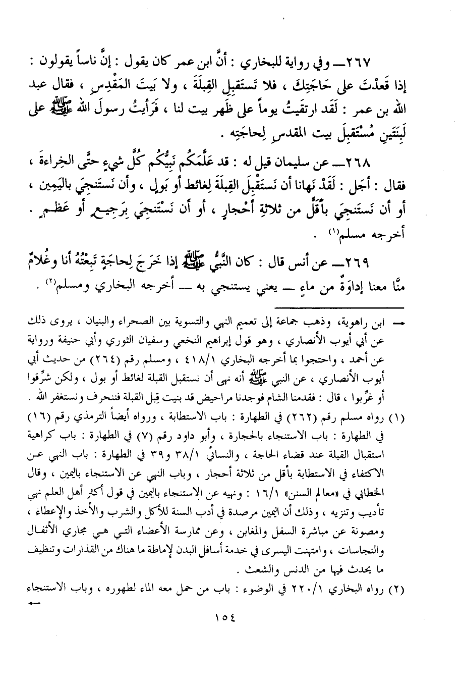 267 - وفي رواية للبخاري: أنَّ ابن عمر كان يقول: إنَّ ناسًا يقولون: إذا قَعدْتَ على حَاجَتِكَ، فلا تَستَقبِلِ القِبلَةَ، ولا بَيتَ المَقْدِسِ، فقال عبد الله بن عمر: لَقَد ارتقَيتُ يومًا على ظَهر بيت لنا، فَرَأيتُ رسولَ الله - صلى الله عليه وسلم - على لَبِنَتَينِ مُسْتَقبِلَ بيت المقدسِ لِحاجَتِه.