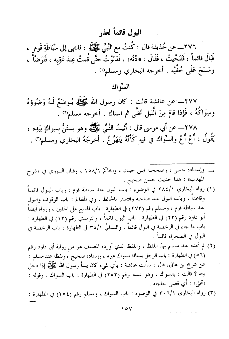 276 - عن حُذيفة قال: كُنتُ مِع النَّبيِّ - صلى الله عليه وسلم -، فانتهى إلى سُبَاطَةِ قومٍ، فَبَالَ قائمًا، فَتَنَحَّيتُ، فَقَالَ: "ادْنُه"، فدَنَوْتُ حتَّى قُمتُ عِندَ عَقِبِه، فَتَوَضَّأ، ومَسَحَ عَلَى خُفَّيْه. أخرجه البخاري ومسلم (¬1).