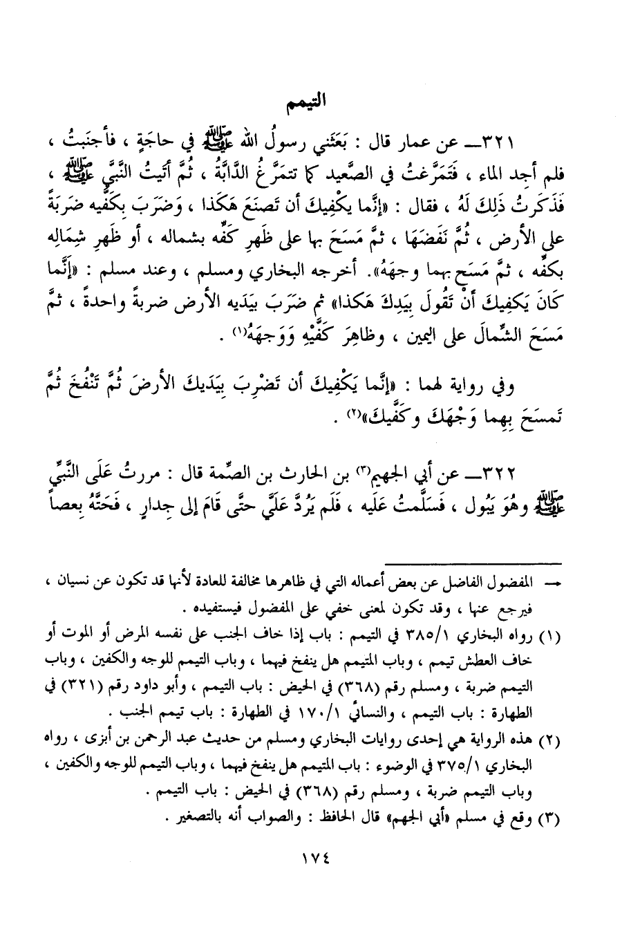 321 - عن عمار قال: بَعَثَني رسولُ الله - صلى الله عليه وسلم - في حاجَةٍ، فأجنَبتُ، فلم أجِد الماء، فَتَمَرَّغتُ في الصَّعيد كما تتمَرَّغُ الدَّابَّةُ، ثُمَّ أتَيتُ النَّبيَّ - صلى الله عليه وسلم -، فَذَكَرتُ ذَلِكَ لَهُ، فقال: "إنَّما يكْفِيكَ أن تَصنَعَ هَكَذا، وَضَرَبَ بِكَفَّيه ضَربَةً على الأرض، ثُمَّ نَفَضَهَا، ثمَّ مَسَحَ بها على ظَهرِ كَفِّه بشماله، أو ظَهرِ شِمَالِه بكفِّه، ثمَّ مَسَح بهما وجهَهُ". أخرجه البخاري ومسلم، وعند مسلم: "إنَّما كَانَ يَكفِيكَ أنْ تَقُولَ بِيَدِكَ هَكذا" ثم ضَرَبَ بيَدَيه الأرض ضربةً واحدةً، ثمَّ مَسَحَ الشِّمالَ على اليمين، وظاهِرَ كَفَّيْهِ وَوَجهَهُ (¬1).