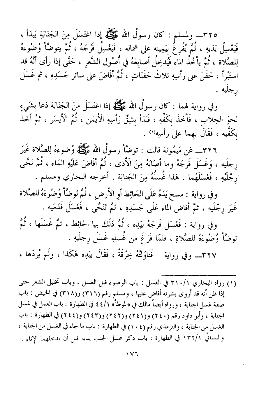 325 - ولمسلم: كان رسولُ الله - صلى الله عليه وسلم - إذا اغتَسَلَ مِنَ الجَنَابَةِ يَبدَأ، فَيَغْسِلُ يَدَيهِ، ثُمَّ يُفْرِغُ بِيَمِينه على شماله، فَيَغْسِلُ فَرْجَهُ، ثُمَّ يتوضَّأ وُضُوءهُ لِلصَّلاة، ثُمَّ يأخُذُ الماء فَيُدخِلُ أصابِعَهُ في أُصُولِ الشَّعرِ، حَتَّى إذا رأى أنَّهُ قد استَبْرأ، حَفَنَ على رأسِهِ ثلاثَ حَفَنَاتٍ، ثُمَّ أَفَاضَ على سائر جَسَدِهِ، ثم غَسَلَ رِجلَيه.