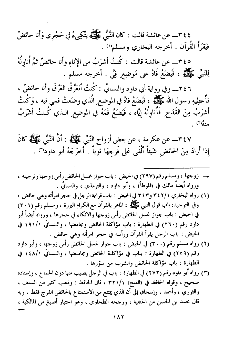 344 - عن عائشة قالت: كان النَّبيُّ - صلى الله عليه وسلم - يتِّكِئُ في حَجْرِي وَأنا حائضٌ فيَقرَأُ القُرآن. أخرجه البخاري ومسلم (¬1).