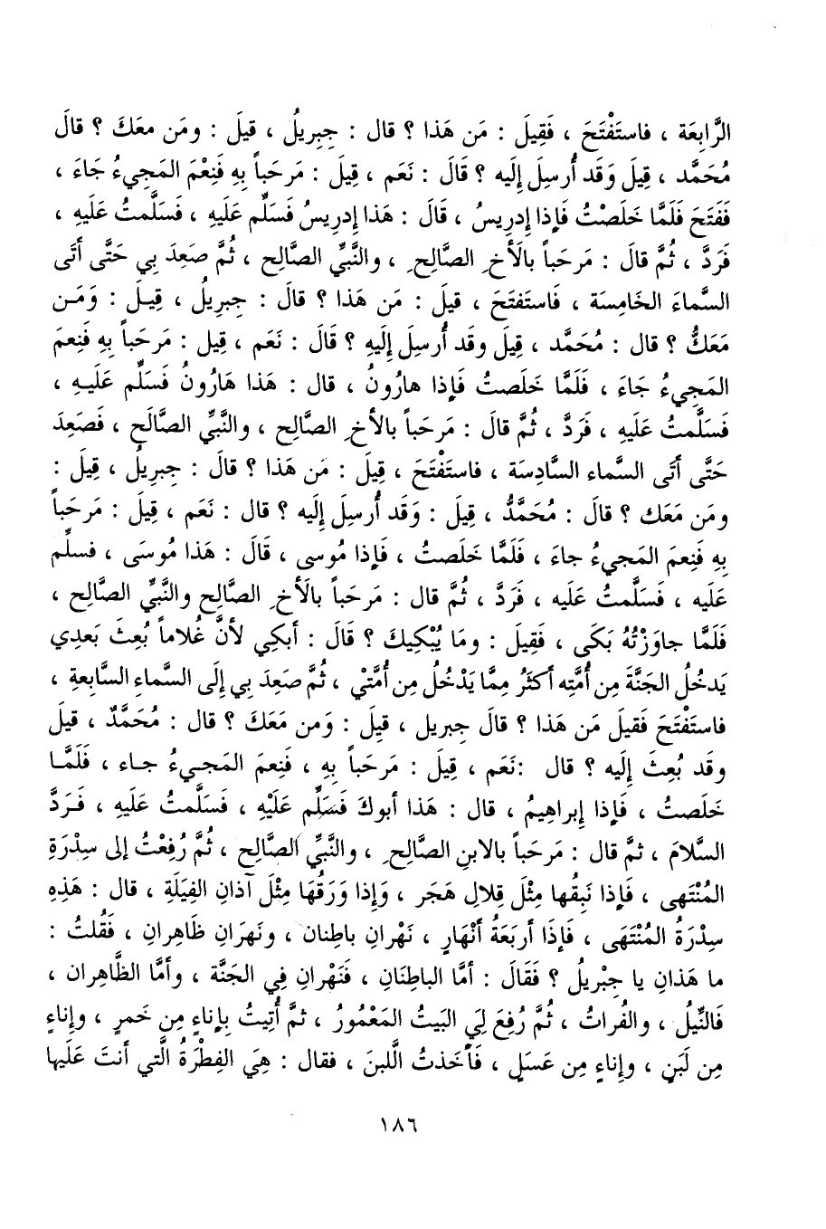 الرَّابِعَة، فاستَفْتَحَ، فَقِيلَ: مَن هَذا؟ قال: جِبِريلُ، قيلَ: ومَن معَكَ؟ قالَ مُحَمَّد، قِيلَ وَقَد أُرسِلَ إِلَيه؟ قَالَ: نَعَم، قِيلَ: مَرحَبًا بِهِ فَنِعْمَ المَجِيءُ جَاءَ، فَفَتَحَ فَلَمَّا خَلَصْتُ فَإذا إِدرِيسُ، قَالَ: هَذا إِدرِيسُ فَسَلِّم عَلَيهِ، فَسَلَّمتُ عَلَيهِ، فَرَدَّ، ثُمَّ قالَ: مَرحَبًا بالَأخِ الصَّالِحِ، والنَّبيِّ الصَّالِح، ثُمَّ صَعِدَ بِي حَتَّى أَتَى السَّماءَ الخَامِسَة، فَاستَفتَحَ، قيلَ: مَن هَذا؟ قالَ: جِبرِيلُ، قِيلَ: وَمَن مَعَكَ؟ قال: مُحَمَّد، قِيلَ وقَد أُرسِلَ إِلَيهِ؟ قَالَ: نَعَم، قِيل: مَرحَبًا بِهِ فنِعمَ المَجِيءُ جَاءَ، فَلَمَّا خَلَصتُ فَإذا هارُونُ، قال: هَذا هَارُونُ فَسَلِّم عَلَيهِ، فَسَلَّمتُ عَلَيهِ، فَرَدَّ، ثُمَّ قالَ: مَرحَبًا بالأخِ الصَّالِح، والنَّبيِّ الصَّالِح، فَصَعِدَ حَتَّى أَتَى السَّماء السَّادِسَة، فاستَفْتَحَ، قِيلَ: من هَذا؟ قالَ: جِبرِيلُ، قِيلَ: ومَن مَعَك؟ قالَ: مُحَمَّدُّ، قِيلَ: وَقَد أُرسِلَ إِلَيه؟ قال: نَعَم، قِيلَ: مَرحَبًا بِهِ فَنِعمَ المَجيءُ جاءَ، فَلَمَّا خَلَصتُ، فَإِذا مُوسى، قَالَ: هَذا مُوسَى، فسلِّم عَلَيه، فَسَلَّمتُ عَلَيه، فَرَدَّ، ثُمَّ قال: مَرحَبًا بالأَخِ الصَّالِح والنَّبيِّ الصَّالِح، فَلَمَّا جاوَزْتُهُ بَكَى، فَقِيلَ: ومَا يُبْكِيكَ؟ قَالَ: أبكِي لأنَّ غُلامًا بُعِثَ بَعدِي يَدخُلُ الجَنَّةَ مِن أُمَّتِه أَكثَرُ مِمَّا يَدْخُلُ مِن أُمَّتي، ثُمَّ صَعِدَ بِي إِلَى السَّماءِ السَّابِعةِ، فاستَفْتَحَ فَقيلَ مَن هَذا؟ قالَ جِبريل، قيِلَ: وَمن مَعَكَ؟ قال: مُحَمَّدٌ، قيلَ وقَد بُعِثَ إِلَيه؟ قال: نَعَم، قِيلَ. مَرحَبًا بِهِ، فَنِعمَ المَجيءُ جاء، فَلَمَّا خَلَصتُ، فَإذا إِبراهِيمُ، قال: هَذا أبوكَ فَسَلِّم عَلَيْهِ، فَسَلَّمتُ عَلَيهِ، فَرَدَّ السَّلامَ، ثمَّ قال: مَرحَبًا بالابنِ الصَّالِحِ، والنَّبيِّ الصَّالِح، ثُمَّ رُفِعْتُ إلى سِدْرَةِ المُنْتَهى، فَإذا نَبِقُها مِثْلَ قِلالِ هَجَر، وَإِذا وَرَقُهَا مِثْلَ آذانِ الفِيَلَةِ، قال: هَذِهِ سِدْرَةُ المُنْتَهَى، فَإذَا أربَعَةُ أنْهَارٍ، نَهْرانِ باطِنان، ونَهرَانِ ظَاهِرانِ، فَقُلتُ: ما هَذانِ يا جِبْريلُ؟ فَقَالَ: أمَّا الباطِنَانِ، فنَهْرانِ فِي الجَنَّة، وأمَّا الظَّاهِران، فَالنِّيلُ، والفُراتُ، ثُمَّ رُفِعَ لِيَ البَيتُ المَعْمُورُ، ثمَّ أُتِيتُ بِإناءٍ مِن خَمرٍ، وإِناءٍ مِن لَبَنٍ، وإِناءٍ مِن عَسَلٍ، فَأَخَذتُ الَّلبنَ، فقال: هِيَ الفِطرةُ الَّتي أنتَ عَلَيها