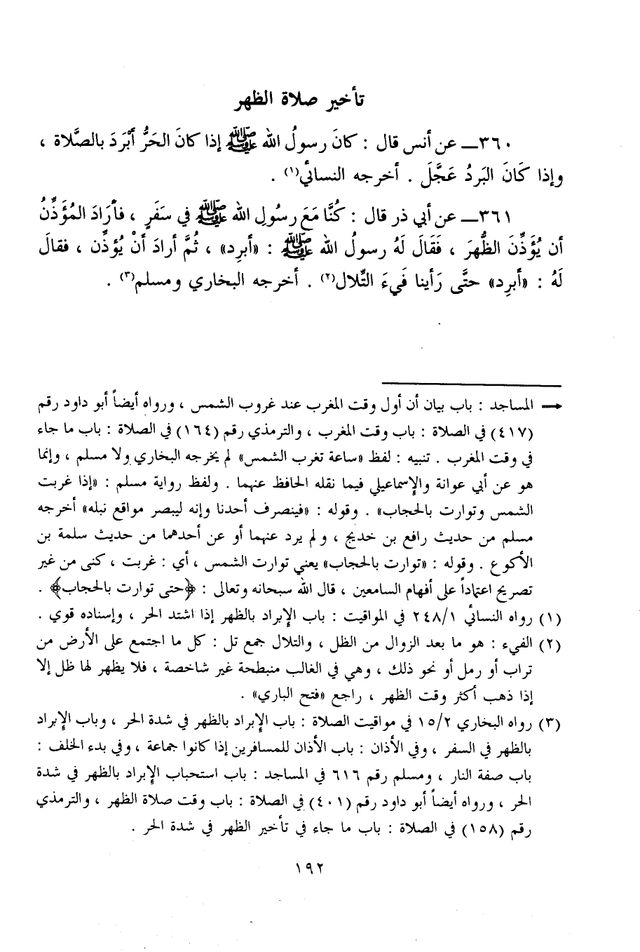 361 - عن أبي ذر قال: كُنَّا مَعَ رسُولِ الله - صلى الله عليه وسلم - في سَفَرٍ، فأرَادَ المُؤَذِّنُ أن يُؤَذِّنَ الظُّهرَ، فَقَالَ لَهُ رسولُ الله - صلى الله عليه وسلم -: "أَبرِد"، ثُمَّ أرادَ أَنْ يُؤذِّن، فقالَ لَهُ: "أَبرِد" حتَّى رَأينا فَيءَ التِّلال (¬2). أخرجه البخاري ومسلم (¬3).