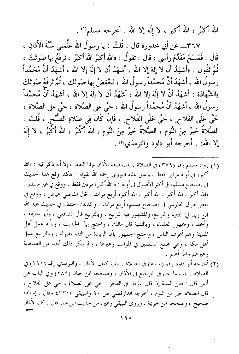367 - عن أبي محذورة قال: قُلتُ: يا رسولَ الله عَلِّمني سُنَّةَ الأَذانِ، قَالَ: فَمَسَحَ مُقَدِّمَ رأسي، قال: تقولُ: "الله أكبَرُ الله أكبَرُ، تَرفَعُ بها صَوتَكَ، ثُمَّ تَقُول: "أشهَدُ أن لا إلهَ إلا الله، أشهَدُ أن لا إلَهَ إلا الله، أشهَدُ أنَّ مُحَمَّدًا رسولُ الله، أشهَدُ أنَّ مُحمَّدًا رسولُ الله، تَخْفِضُ بِها صَوتَك، ثُمَّ تَرفَعُ صَوتَكَ بالشَّهادَة: أشهَدُ أنْ لا إلَهَ إلا الله، أشْهَدُ أن لا إلَهَ إلا الله، أشهَدُ أنَّ مُحمَّدًا رسولُ الله، أشهَدُ أنَّ مُحمَّدًا رسولُ الله، حيَّ على الصَّلاة، حيَّ على الصَّلاة، حَيَّ عَلَى الفَلاحِ، حَيَّ عَلَى الفَلاحِ، فَإنْ كَان فِي صَلاةِ الصُّبْحِ، قُلتَ: الصَّلاةُ خَيرٌ مِنَ النَّوم، الصَّلاةُ خَيرٌ مِنَ النَّوم، الله أَكْبَرُ، الله أَكْبَرُ، لا إِلَهَ إلا الله". أخرجه أبو داود والترمذي (¬2).