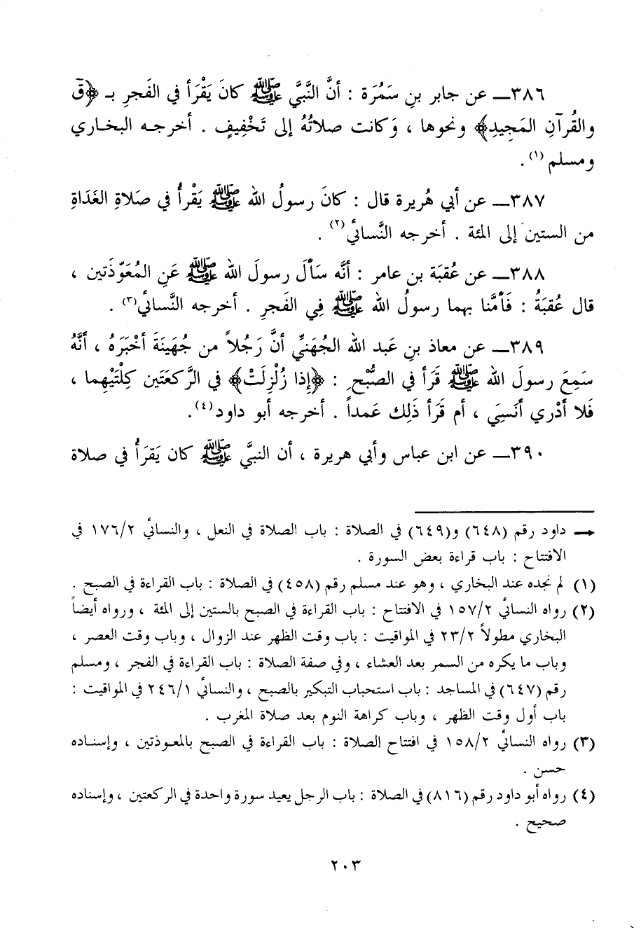 388 - عن عُقبَة بن عامر: أنَّه سَألَ رسولَ الله - صلى الله عليه وسلم - عَنِ المُعَوِّذَتين، قال عُقبَةُ: فَأمَّنا بهما رسولُ الله - صلى الله عليه وسلم - فِي الفَجرِ. أخرجه النَّسائي (¬3).