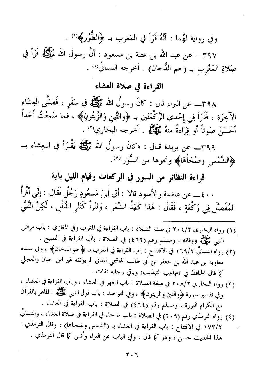 (¬3) رواه البخاري 2/ 208 في صفة الصلاة: باب الجهر في العشاء، وباب القراءة في العشاء، وفي تفسير سورة {وَالتِّينِ وَالزَّيْتُونِ}، وفي التوحيد: باب قول النبي - صلى الله عليه وسلم -: الماهر بالقرآن مع الكرام البررة، ومسلم رقم (464) في الصلاة: باب القراءة في العشاء.